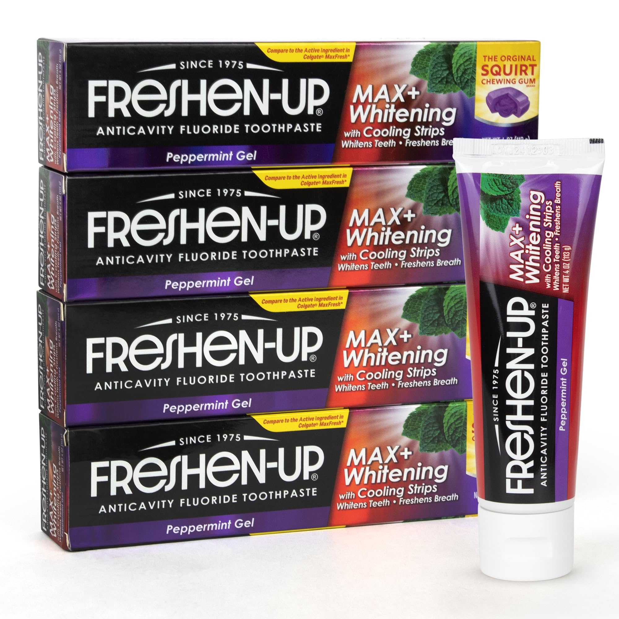 Keep your smile bright and your breath fresh every day with Freshen-Up MAX Whitening Anticavity Toothpaste. This 4-pack includes four full-size 4 oz tubes of our invigorating peppermint-gel formula, combining proven anticavity fluoride with Cooling Strips Technology for a powerful clean. The MAX Whitening formula helps remove surface stains with daily brushing, while fluoride strengthens enamel and protects against cavities. The smooth gel delivers a cool, refreshing sensation that leaves your mouth feeling clean and revitalized. Freshen-Up supports your daily oral-care routine by helping reduce plaque bacteria , promoting strong enamel, and keeping your smile at its best. This value 4-pack is ideal for home use, travel, or stocking up for the whole family. Fights plaque bacteria – a leading cause of gingivitis.