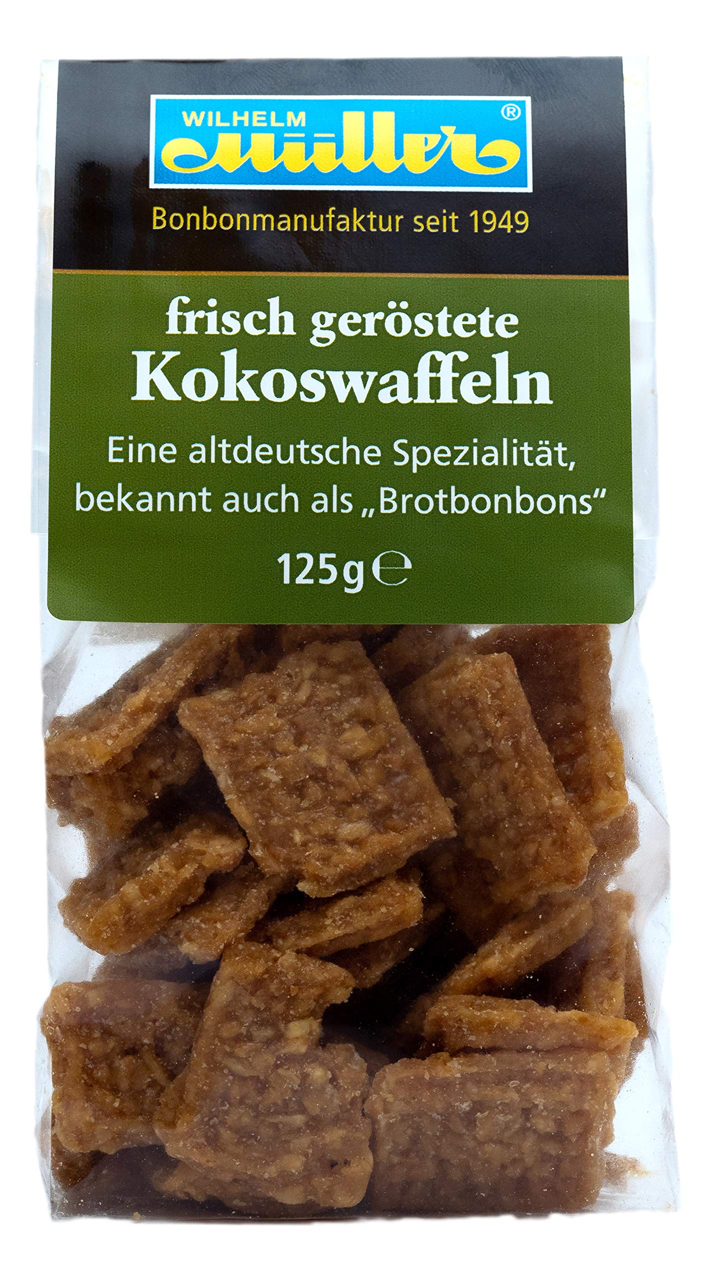 Frisch geröstete Kokuswaffeln (8 Tüten) INHALTSSTOFFE / ZUTATEN Zucker, Glukosesirup, Kokusraspeln, Salz ANSCHRIFT HERSTELLER/IMPORTEUR Wilhelm Müller Spezialfabrik für Kräuterbonbons GmbH & Co. KG, Weißenburgstrasse 15-17, 47229 Duisburg Mehr