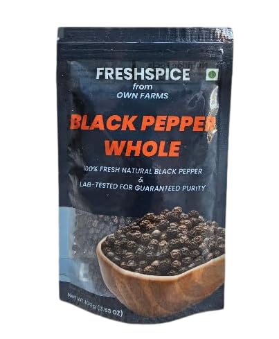 FreshSpice Black Pepper Whole Experience the rich, robust flavor of FreshSpice Black Pepper Whole, directly harvested from the lush, verdant farms of Idukki, Kerala. Known for producing some of the world's finest spices, Idukki's unique climate and fertile soil yield black pepper with an unparalleled depth of flavor and aroma. Our black pepper is meticulously handpicked to ensure only the highest quality peppercorns make it to your kitchen. Each batch is lab tested for purity, guaranteeing that you receive a product free from contaminants and full of natural goodness. Whether you're grinding it fresh over your favorite dishes or using it to enhance the complexity of your culinary creations, FreshSpice Black Pepper Whole adds a vibrant, spicy kick that's both authentic and aromatic. Elevate your cooking with the pure, potent flavor of FreshSpice Black Pepper – a staple for any discerning chef.Convenient Zip Lock Packaging: Maintains freshness and flavor, making storage easy and efficient. Rich Aroma: Delivers an intense, authentic fragrance that enhances any dish. No Preservatives: 100 natural, with no added chemicals or artificial preservatives. Freshly Harvested: Directly sourced from the farms of Idukki, Kerala, capturing the peak flavor and aroma. Lab Tested for Purity: Ensures the highest quality and safety, free from contaminants.