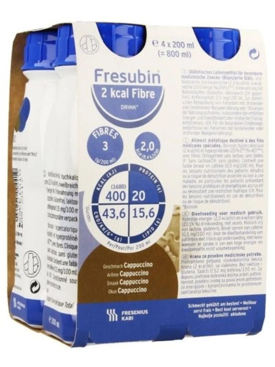 Fresubin drink 2 kcal with dietary fiber with cappuccino flavor 200 ml n4 for enteric nutrition. for enteral nutrition for dietary therapy of children over 6 years of age and adults at risk of malnutrition and conditions requiring high energy and protein expenditure or patients with dysphagia glucose syrup, sucrose, milk protein, milk protein concentrate, sunflower oil, rapeseed oil, maltodextrin, vitamin mix (vit. c, vit. pp, ?-carotene, pantothenic acid, vit. e, vit. b6, vit. b2, vit. b1, vit. a, folic acid, vit. k1, biotin, vit. d3, vit. b12) ascorbic acid, vitamin d3, zinc sulfate, sodium citrate, sodium chloride, sodium ascorbate, magnesium oxide, iron pyrophosphate, manganese chloride, copper sulfate, sodium fluoride, chromium chloride, sodium molybdate, sodium selenite, potassium iodide, potassium citrate citrate, thickener (e1442), stabilizers (e471, soy lecithin, e407), acidity regulator (e 501), water, natural flavoring: cappuccino, caramel