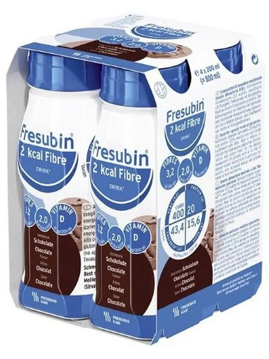 FRESUBIN DRINK 2 KCAL WITH FIBRE, CHOCOLATE FLAVOUR, 200ML N4 D/ENTER PIT. Fresubin brand - special enteral nutrition. FRESUBIN DRINK 2 KCAL WITH FIBRE, CHOCOLATE FLAVOUR - ready-to-use, complete, high-calorie (2 kcal / ml) oral nutrition with a high protein content (20% energy), with dietary fiber. Has a pleasant taste. A specialized product for enteral nutrition - intended for children from 6 years of age and adults at risk of malnutrition and conditions requiring high energy and protein expenditure and / or fluid restriction. Suitable as the sole source of nutrition. Does not contain lactose and gluten. When using, it is necessary to ensure an adequate water regime. 200 ml contains: Proteins - 20 g. Fat - 15.6 g. Carbohydrates - 43.6 g. Dietary fiber - 3 g. Calories - 1680 kJ (400 kcal) Average content per 100 ml: Energy value. . . . . . . . . .840 kJ (200 kcal) Fat. . . . . . . . . . . . . . . . . . . . . . . . . . . . . . 7.8 g of which saturated fatty acids . . . . . . . . . . . . .0.6 g of which monounsaturated fatty acids. . . . . . 5.8 gof which polyunsaturated fatty acids. . . . . . 1.4 gCarbohydrates . . . . . . . . . . . . . . . . . . . . . . . . . . . 21.8 gof which sugars. . . . . . . . . . . . . . . . . . . . . 5.4 gof which lactose . . . . . . . . . . . . . . . . . . . . . ? 0.3 gDietary fiber . . . . . . . . . . . . . . . . . . . . . . . . . .1.5 g Protein. . . . . . . . . . . . . . . . . . . . . . . . . . . . . . . . . . . .10.0 gSalt (Na x 2.5). . . . . . . . . . . . . . . . . . . . . . . . . . . . .0.15 gWater. . . . . . . . . . . . . . . . . . . . . . . . . . . . . . . . . . . . . 68 mlOsmolarity. . . . . . . . . . . . . . . . . . . . 615 mosm/lOsmolality. . . . . . . . . . . . . . . . 900 mosm/kg H2OMinerals:Sodium. . . . . . . . . . . . . . . . . . . . . 60 mg/2.6 mmolPotassium. . . . . . . . . . . . .