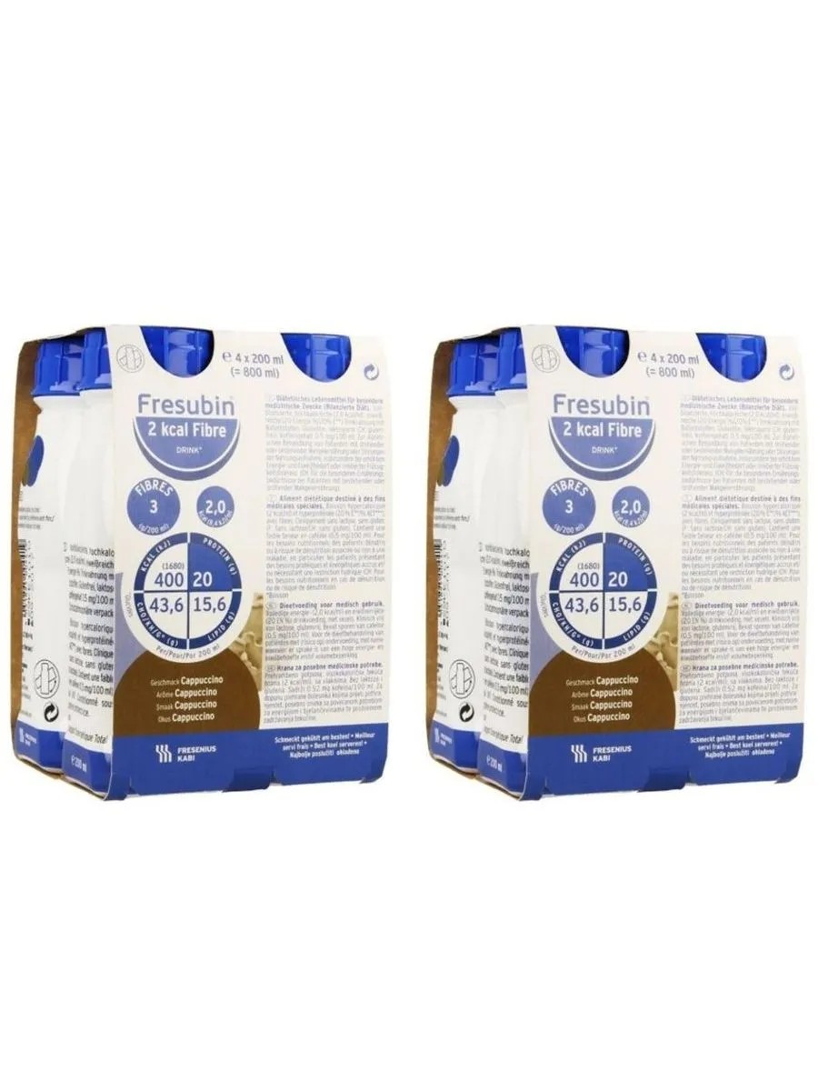 Fresubin drink 2 kcal with dietary fiber with cappuccino flavor 200 ml n4 for enteric nutrition. for enteral nutrition for dietary therapy of children over 6 years of age and adults at risk of malnutrition and conditions requiring high energy and protein expenditure or patients with dysphagia glucose syrup, sucrose, milk protein, milk protein concentrate, sunflower oil, rapeseed oil, maltodextrin, vitamin mix (vit. c, vit. pp, ?-carotene, pantothenic acid, vit. e, vit. b6, vit. b2, vit. b1, vit. a, folic acid, vit. k1, biotin, vit. d3, vit. b12) ascorbic acid, vitamin d3, zinc sulfate, sodium citrate, sodium chloride, sodium ascorbate, magnesium oxide, iron pyrophosphate, manganese chloride, copper sulfate, sodium fluoride, chromium chloride, sodium molybdate, sodium selenite, potassium iodide, potassium citrate citrate, thickener (e1442), stabilizers (e471, soy lecithin, e407), acidity regulator (e 501), water, natural flavoring: cappuccino, caramel