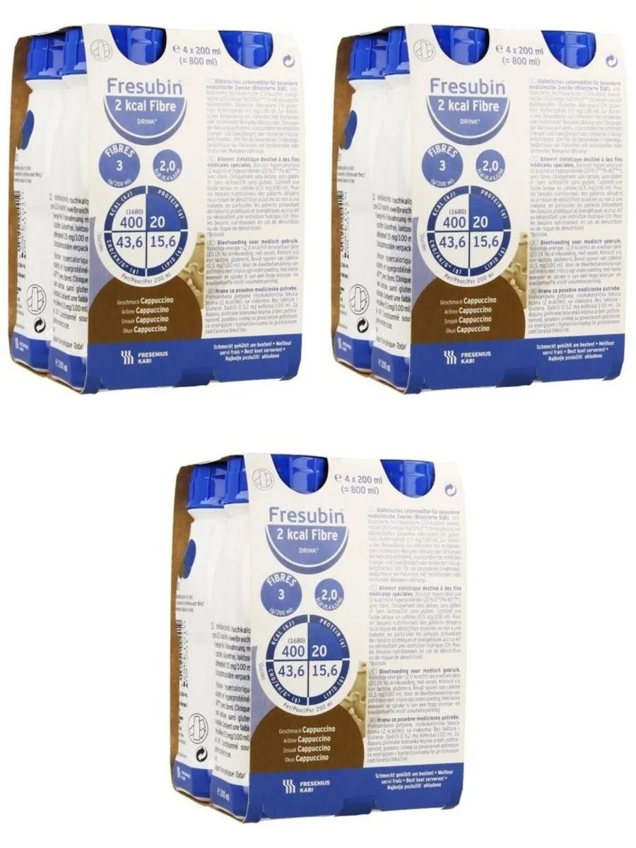 Fresubin drink 2 kcal with dietary fiber with cappuccino flavor 200 ml n4 for enteric nutrition. for enteral nutrition for dietary therapy of children over 6 years of age and adults at risk of malnutrition and conditions requiring high energy and protein expenditure or patients with dysphagia glucose syrup, sucrose, milk protein, milk protein concentrate, sunflower oil, rapeseed oil, maltodextrin, vitamin mix (vit. c, vit. pp, ?-carotene, pantothenic acid, vit. e, vit. b6, vit. b2, vit. b1, vit. a, folic acid, vit. k1, biotin, vit. d3, vit. b12) ascorbic acid, vitamin d3, zinc sulfate, sodium citrate, sodium chloride, sodium ascorbate, magnesium oxide, iron pyrophosphate, manganese chloride, copper sulfate, sodium fluoride, chromium chloride, sodium molybdate, sodium selenite, potassium iodide, potassium citrate citrate, thickener (e1442), stabilizers (e471, soy lecithin, e407), acidity regulator (e 501), water, natural flavoring: cappuccino, caramel
