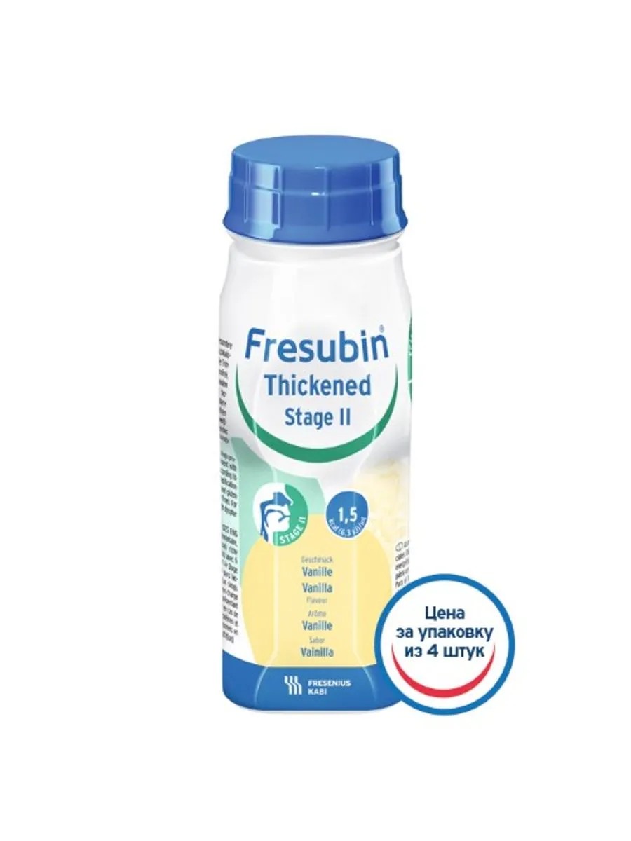 фрезубин сгущенный уровень 2 со вкусом ванили n4 д/энтер пит. для энтерального питания для диетотерапии пациентов с риском недостоточного питания и состояниями, требующими высоких затрат энергии и белка или пациентов с дисфагией сахароза, мальтодекстрин, инулин, цельный белок молока, концентрат белка молока, подсолнечное масло, рапсовоемасло, витаминный микс (вит. с, вит. pp, ?-каротин, пантотеновая кислота, вит. e, вит. b6, вит. b2, вит. b1, вит. a, фолиеваякислота, вит. k1, биотин, вит. d3, вит. b12), аскорбиновая кислота (вит. с), токоферола ацетат (вит. е), ?-каротин, витамина, калия цитрат, натрия хлорид, магния оксид, магния дицитрат, железо пирофосфат, цинка сульфат, меди сульфатмарганца хлорид, натрия фторид, хрома хлорид, натрия молебдат, натрия селенит, калия йодид, загуститель е 1442,стабилизаторы (соевый лецитин, е 471, е 407), вода, ароматизатор натуральный ваниль-сливки,