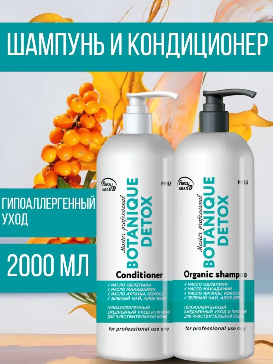 FREZY GRAND TM presents: MASTER PROFESSIONAL Series - HAIR CARE, NOURISHMENT, AND TREATMENT. BOTANIQUE DETOX CONDITIONER, SHAMPOO. pH 5.5. HAIR SHAMPOO AND CONDITIONER WITH SEA BUCKTHORN OIL - BOTANIQUE DETOX. Shampoo and conditioner for daily hair care gently cleanses, strengthens, and protects from UV rays. Daily use promotes overall improvement of the hair and scalp condition. Sea buckthorn oil is rich not only in acids and vitamins, but also in antioxidants, which have a positive effect on the scalp. The oil has a softening and nourishing effect. Green tea contains tannin, vitamins E, A, F, and B. Thanks to this, it strengthens follicles and reduces split ends. Suitable for all hair types. Free of silicones, parabens, and dyes. Only gentle and effective hair cleansing. The formula with coconut oil and aloe vera infuses hair with nourishing ingredients. The result: healthy-looking and shiny hair. Special technology helps prevent further keratin loss due to the negative impact of external factors. This shampoo provides deep cleansing of the scalp and hair, helping to restore damaged hair structure. It eliminates the accumulation of toxins and prevents their harmful effects on hair follicles. It has strong antioxidant properties, protects against negative environmental impacts, and helps soothe irritated scalp. Apply shampoo to hair, lather, leave for 1-2 minutes, and rinse thoroughly. Repeat if necessary. For optimal care, use in combination with conditioner. Distribute throughout the lengths and leave for 2-3 minutes. Rinse. Proceed with further treatments or dry your hair. Ingredients: Aqua, Cocamidopropyl Betaine, Sodium Laureth Sulfate, Cocamide DEA, Sodium Lauroyl Sarcosinate, Sodium Cocoamphoacetate, Polyquaternium-7, Glycereth-2, Cocoate, Polyquaternium-44, Glycerin, Betaine, Guar Hydroxypropyltrimonium Chloride, Sodium Chloride, Hippophae rhamnoides (Sea Buckthorn) Oil, Argania Spinosa Kernel Oil, Macadamia Integrifolia Seed Oil, Cocos Nucifera (Coconut) Oil, Camellia Sinensis (Green Tea) Leaf Extract, Aloe Barbadensis Leaf Juice, Parfum, Methylchloroisothiazolinone, Methylisothiazolinone, Citric Acid, EDTA. Organic cosmetics. Shampoo and conditioner with a dispenser. Shampoo + conditioner for daily use. Hair care products. Large conditioner and shampoo suitable for both men and women. Anti-dandruff and anti-itch shampoo. Professional shampoo 1000 ml (1 liter) + conditioner 1000 ml (1 liter).