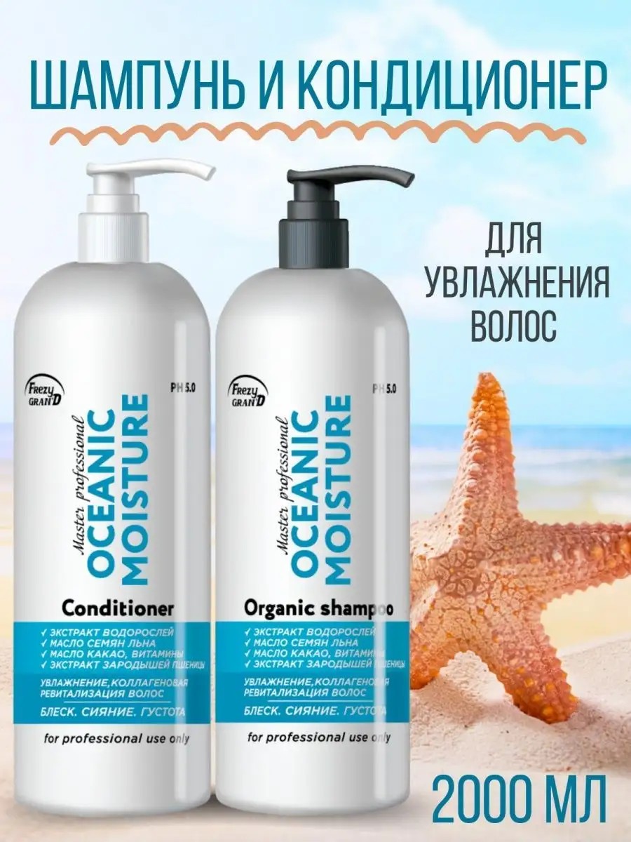 Профессиональный шампунь и кондиционер для волос Frezy Grand Oceanic Moisture PH 5.0 средства комплексного ухода для волос. Формула увлажняющего шампуня и кондиционера для волос на основе экстракта водорослей, органического масла семени льна и гидролизованных белков шелка, обеспечивает глубокое увлажнение и питание волос. Основные свойства шампуня и бальзама: защищают волосы от потери влаги; облегчают расчёсывание; придают блеск и гладкость. Активные компоненты набора для волос способствуют сохранению яркости цвета и восстанавливают поврежденную кутикулу волоса. Питательные вещества, входящие в состав масел какао и семени льна, насыщают волосы изнутри, эффективно предотвращают потерю влаги и обеспечивают рост сильных и здоровых волос. Экстракт водорослей содержит полезные жирные кислоты и витамины, которые устраняют пушистость, придавая гладкость, шелковистость и блеск. Бальзам кондиционер для волос образует защитную микропленку на поверхности каждого волоса, запечатывая поверхность каждого волоса и защищая его от ломкости. Набор шампунь и бальзам Frezy Grand подходит для ежедневного применения и для всех типов волос.