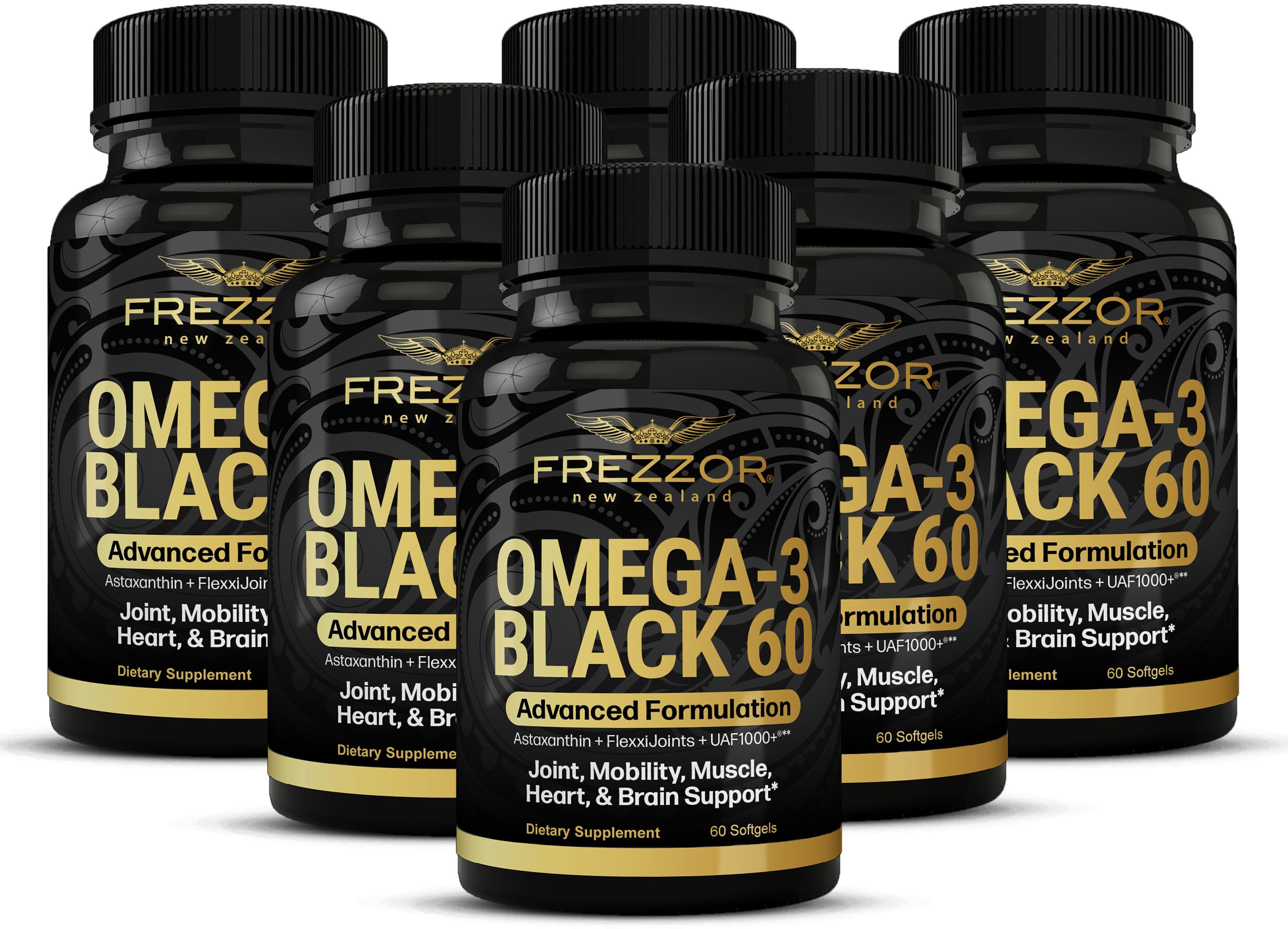 FREZZOR Omega 3 Black for Joint Care & Comfort - New Zealand Green Lipped Mussel Oil Capsules 53x Higher Potency with UAF1000+ Super Antioxidant No Fishy Aftertaste 450mg 6-Pack 360 Softgels