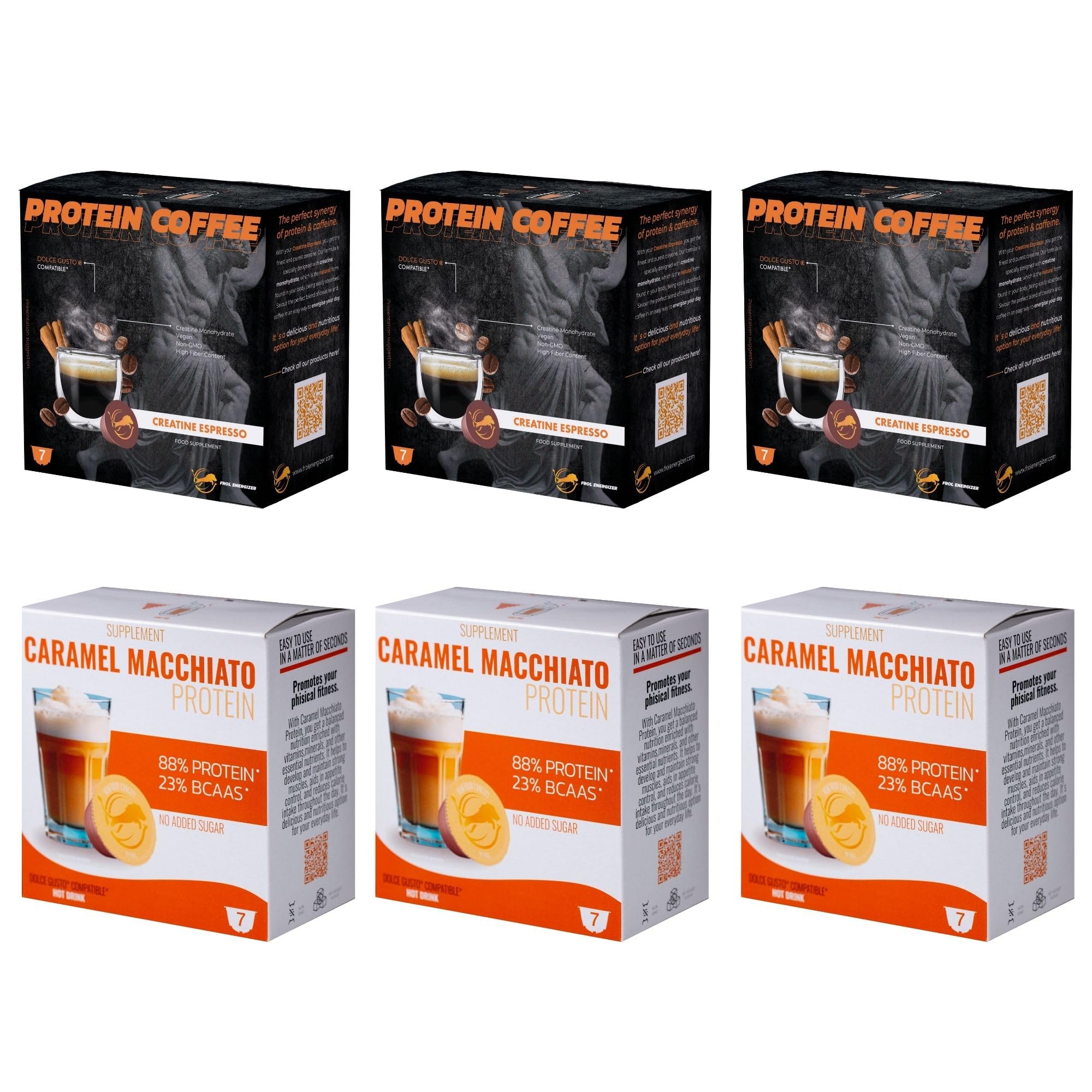 FROL Explorer Ltd Caramel Protein Macchiato & Creatine Espresso Pack 3 Boxes of Each: Gourmet Protein Coffee and Espresso for Muscle Building (Creatine)