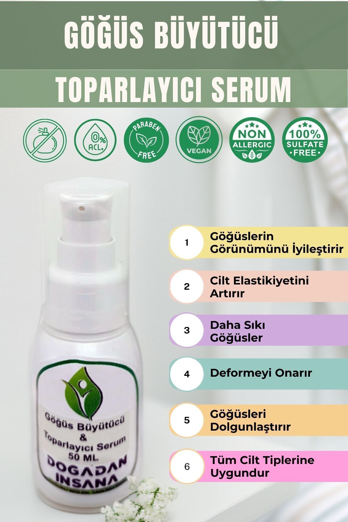 Dolgunlastirici, Sikilastirici ve Toparlayici serumumuz, dogal içerigiylegögüsleriniz için ideal bir bakim seçenegidir. Dolgunlastirici, Sikilastiricive Toparlayici ürünümüz etkili formülüyle dikkat çeker ve süper dönüsler alarakgücünü kanitlamistir. Içeriginde 19 çesit bilesen bulunan bu serum, Omega vevitaminler açisindan zengin olup gögüslerinize dogal bir bakim sunar.