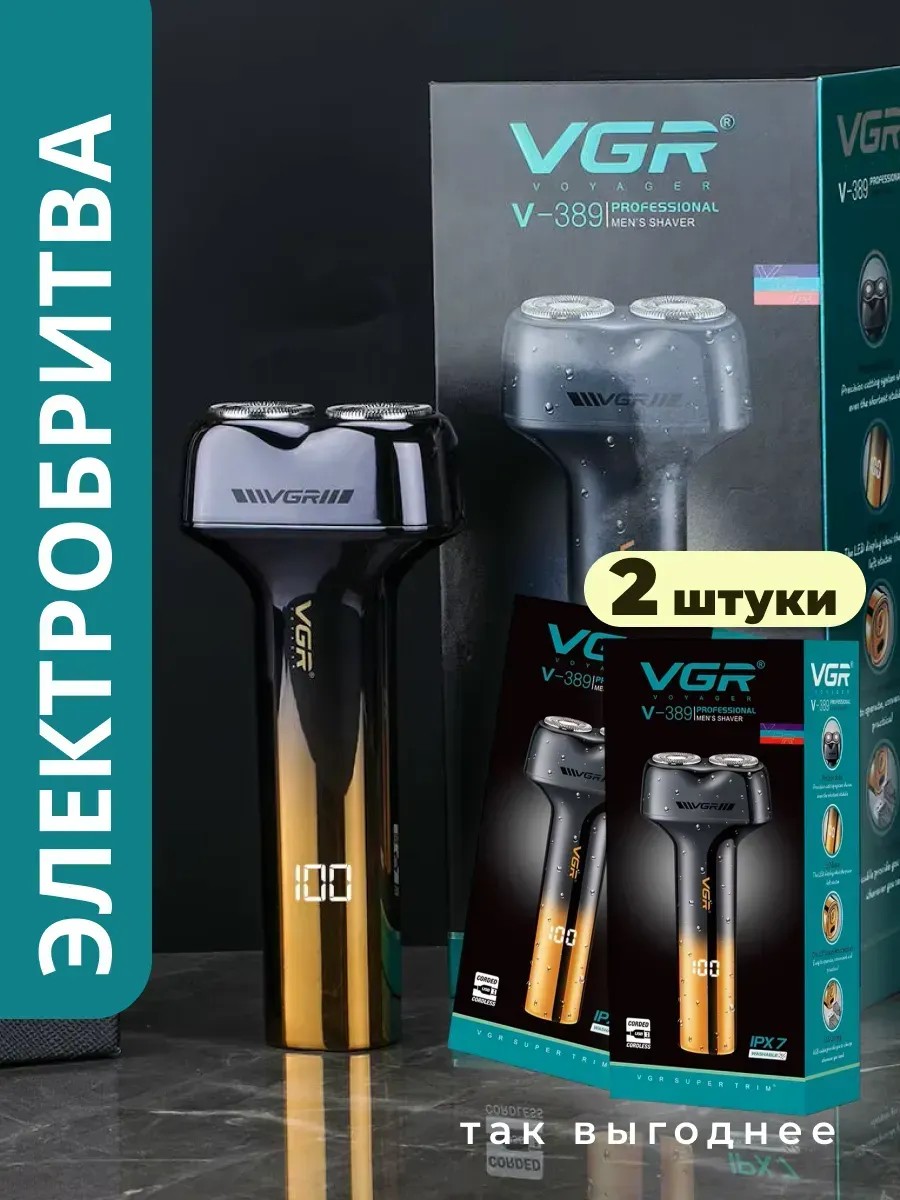 Набор 2 шт. Электробритва мужская VGR V-389 - новая модель. Электрическая бритва с двумя плавающими головками для комфортного и эффективного бритья. Оснащенная острыми и прочными лезвиями из нержавеющей стали, электробритва VGR V-389 обеспечивает близкое и ровное бритье без раздражения кожи. Плавающая головка позволяет эффективно следовать контурам лица, обеспечивая равномерное удаление волосков даже на труднодоступных участках. Электробритва VGR V-389 оснащена мощным и надежным мотором, который обеспечивает стабильную и плавную работу даже при высокой скорости вращения. Это позволяет электробритве справиться с различными типами волос, в том числе с жесткими и плотными. Встроенный аккумулятор с длительным временем работы дает возможность использовать бритву в течение длительного времени без необходимости частой зарядки. Быстрая зарядка позволяет сэкономить время и получить достаточно энергии для одного бритья всего за несколько минут. Бритва может работать до 70 минут после полной зарядки всего за 1.5 часа Для дополнительного комфорта и удобства, электробритва VGR V-389 оснащена режимами работы, позволяющими выбрать оптимальную скорость и настройки под ваше предпочтение и тип кожи. Также, она может использоваться как сухая, так и влажная электробритва, можно использовать с кремом для бритья. Компактный комплект с мешочком для переноски и кабелем делает эту бритву идеальным спутником в путешествиях. Теперь вы можете побриться в любой точке мира - в аэропорту, в отеле перед важной встречей или в командировке, экономя свое время и место. Электробритва хороший подарок мужу, мужчине на 23 февраля, 14 февраля, новый год, день рождения