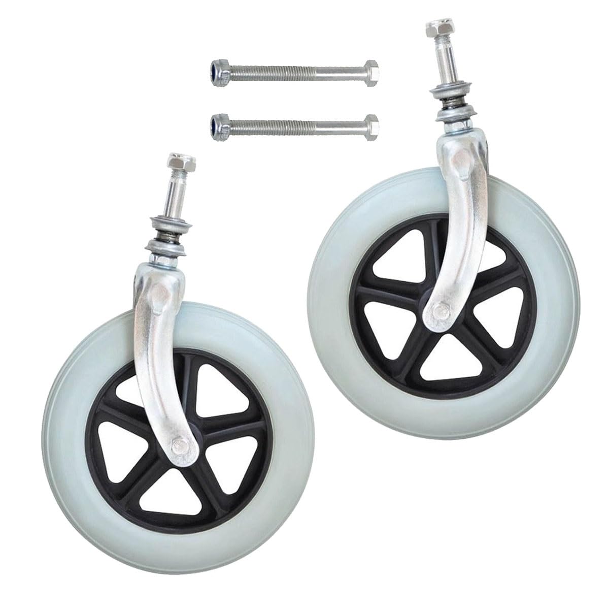 ? The replacement wheelchair front wheel uses high-quality carbon steel to make the front fork, and the PVC solid material to make the wheel, which is not only wear-resistant and shock-absorbing, but also has a higher speed and extremely low noise, bringing you a comfortable use experience. ? The wheels are available in 6 7 8in sizes, with diameters of 15 17 19 20cm to meet your different needs. ? The product colors are gray and black, simple and stylish. ? Equipped with high-quality accessories, complete screws, simple and convenient replacement. ? The package list includes 2 wheels, 2 front forks and 2 screws. ? Choose it to give your wheelchair a new look!? Size: The front fork handle is 6.5cm 2.5in long, and the tire diameter is 6in 15cm, 7in 17cm, 8in 19cm, 8in 20cm, a total of 4 sizes are available to meet your different needs, allowing you to save more money and effort!. ? Floor: Caster Wheel Whether indoors or outdoors, on smooth floors, gravel floors, or even speed bumps, it can walk easily. ? Use: Not only suitable for wheelchair front wheel replacement, but also an ideal replacement for baby stroller wheels. ? Sturdy material: This caster with front fork is a perfect combination of metal carbon steel front fork and solid PVC wheel, and is also equipped with screws, which makes installation extremely simple. ? 2-pack: Front Wheelchair Wheel includes 2 wheels with front fork accessories, black and gray 2 colors to choose from.