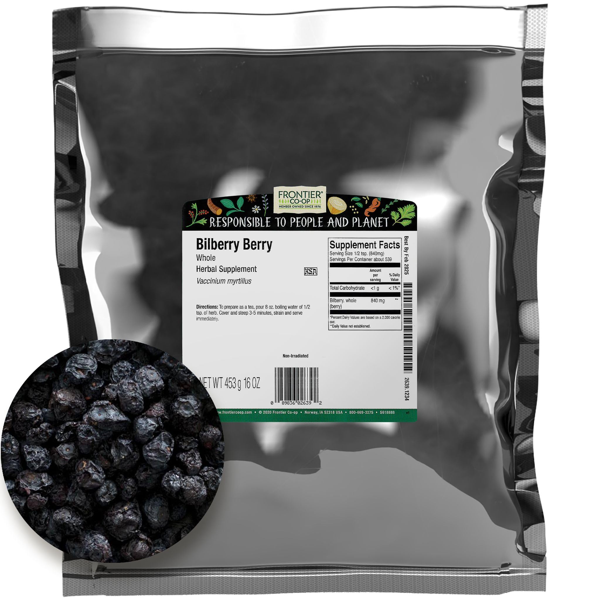 ABOUT US - We are Frontier Co-op. 50,000 member owners strong and a powerful force of good in the world. As an ethically committed herb and spice company, we are united by our mission to put people and planet before profits. COMMITTED TO PEOPLE PLANET - Our sustainable sourcing programs start with a commitment and investment in our growers. We support essential projects like education, medical infrastructure, freshwater initiatives, and sustainable farming practices. Through mutually beneficial partnerships, we are bound and determined to source ingredients ethically and responsibly. WHY BUY BULK – Shopping in bulk has numerous benefits – namely saving you money and helping protect the environment by reducing harmful single-use packaging waste. Our new bulk packaging is easily recyclable and will help keep over 2 million plastic containers and bags out of landfills every year. BEST USES - Bilberries have a wide range of uses and can be enjoyed in various ways. You can eat them as a dessert, steep them in tea to create flavorful infusions, or use them as a delightful garnish for tarts. Their mildly acidic flavor makes them a versatile and delightful addition to your culinary creations. BILBERRY BERRY -Frontier Co-op Bilberry Berry Whole is a delightful fruit with a mildly acidic flavor, closely related to the blueberry. These whole bilberries are rich in blue-red pigments, giving them their distinctive color.