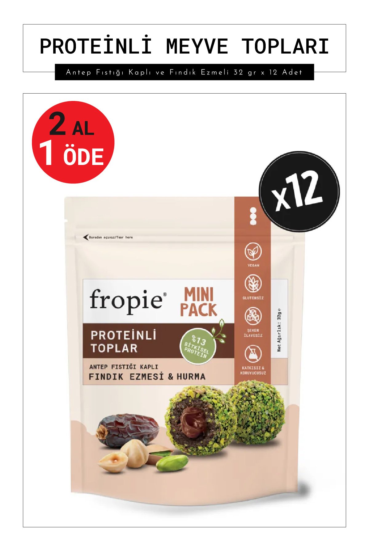 FROP E Mini Vegan Protein Fruit Balls - Pistachio Coated and Hazelnut Paste 32 gr x 12 Pieces