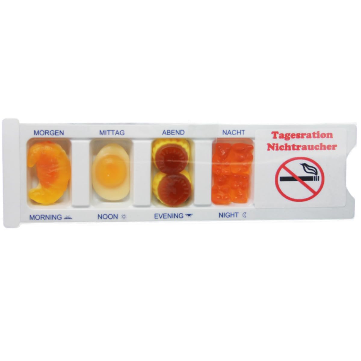 The perfect gag for aspiring non-smokers or as a fun gift: this pillbox-style medicine label contains approximately 25g of delicious fruit candies. Ideal as a party favor, gift, or simply to bring a smile to your face every day. INGREDIENTS glucose syrup, water, sugar, modified starch, gelatin, acidifier: citric acid, malic acid, vegetable oil (palm and coconut oil), glazing agent: carnauba wax, flavorings, acidity regulator: sodium citrate, colors: E102, E129