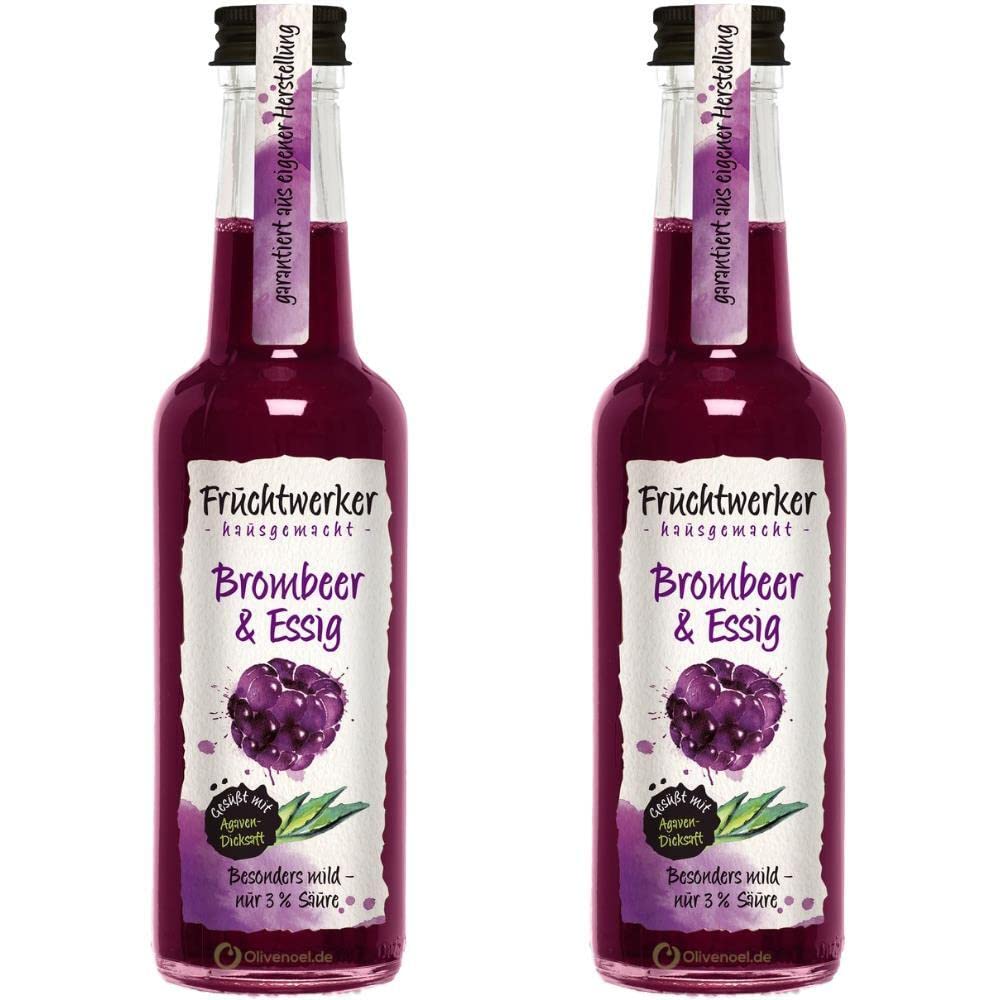 Fruchtwerker Broombeer azijn met sap van echte vruchten zoet met agavendicksap 2 stuks 2 x 250 ml glazen fles