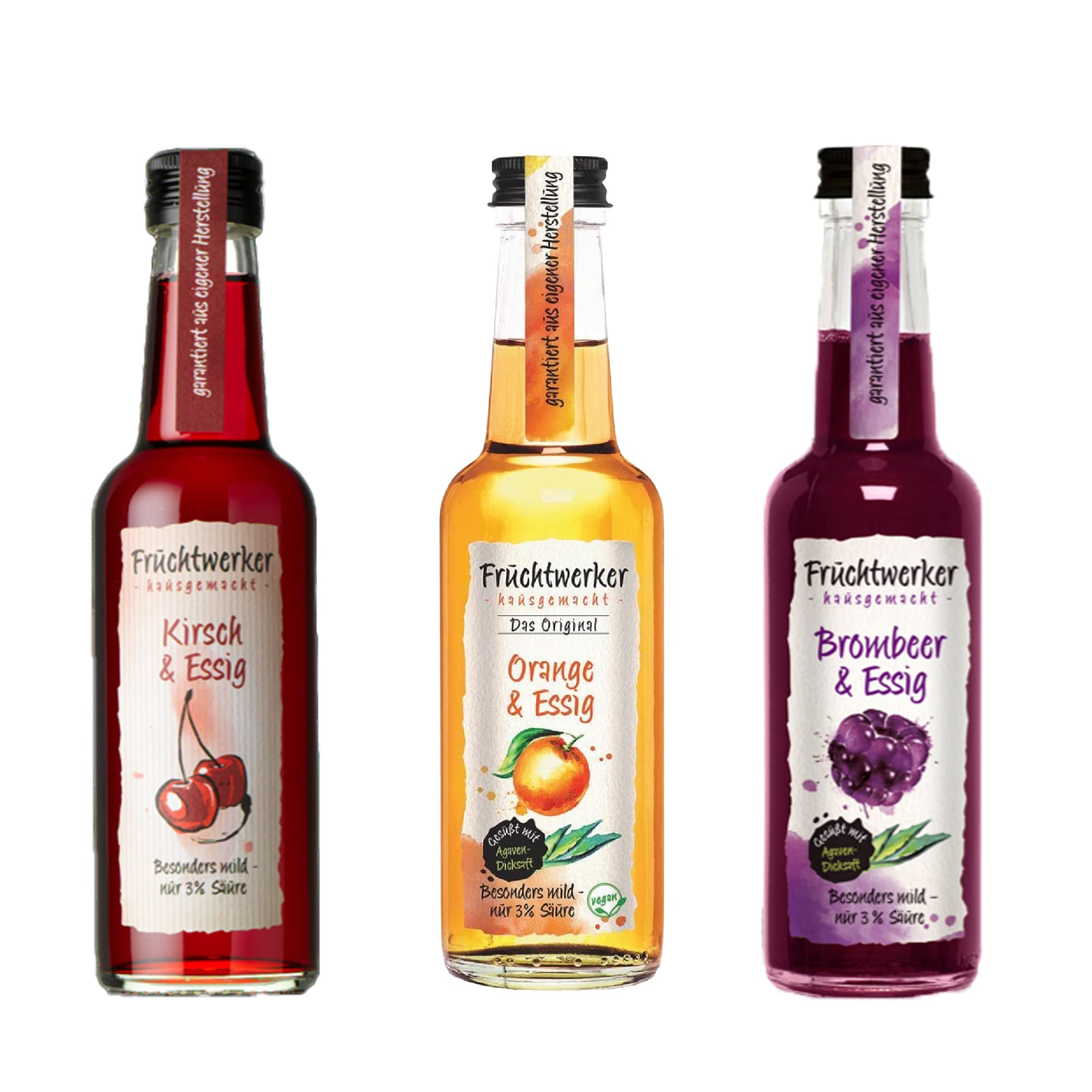 Fruchtwerker Vinegar and Fruit Set I Different Varieties I Fruity I Fruit Vinegar Set I Vinegar I Pure Vegetable I Sweet I In Glass Bottles (Cherry + Orange + Blackberry)