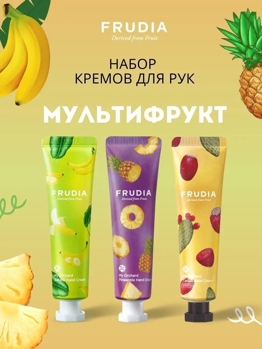 В подарочный набор от корейского бренда FRUDIA входит три ароматизированных крема. В набор входят крема с ароматами банана, ананаса и кактуса.