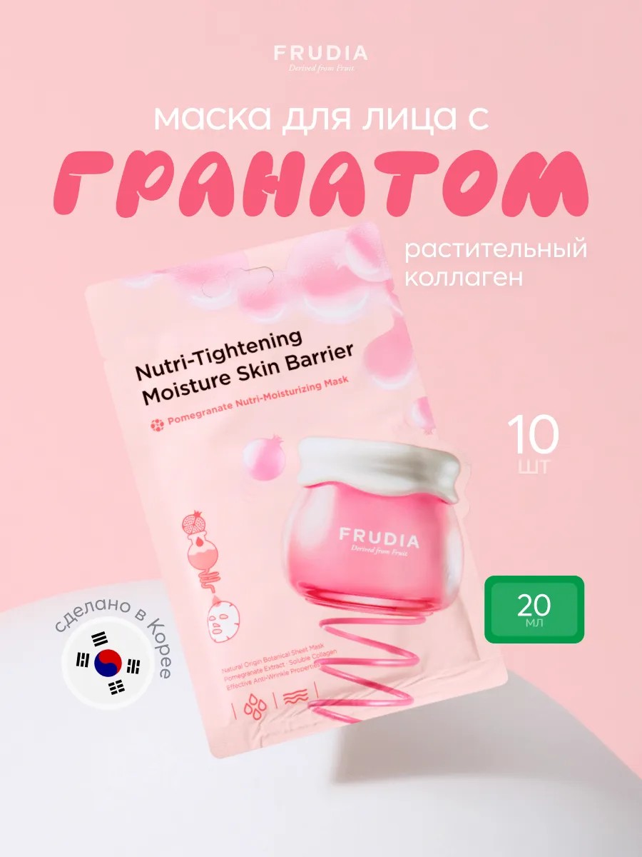 Тканевая маска Frudia, состоящая на 46% из экстракта граната, богатого полифенолом, активно питает и восстанавливает кожу. Полотно маски соткано из натуральных природных трав. Маска плотно и комфортно прилегает к лицу, повторяя все его изгибы, не сползает и не топорщится во время использования и эффективно доставляет активные ингредиенты. Повышает эластичность, разглаживает кожу, наполняя сиянием. Аденозин устраняет мелкие и глубокие морщины, а масло граната и другие масла фруктов питают и смягчают. Маска с натуральным составом подойдет и для чувствительной кожи. Она моментально насытит кожу витаминами, улучшит тон кожи и глубоко увлажнит.
