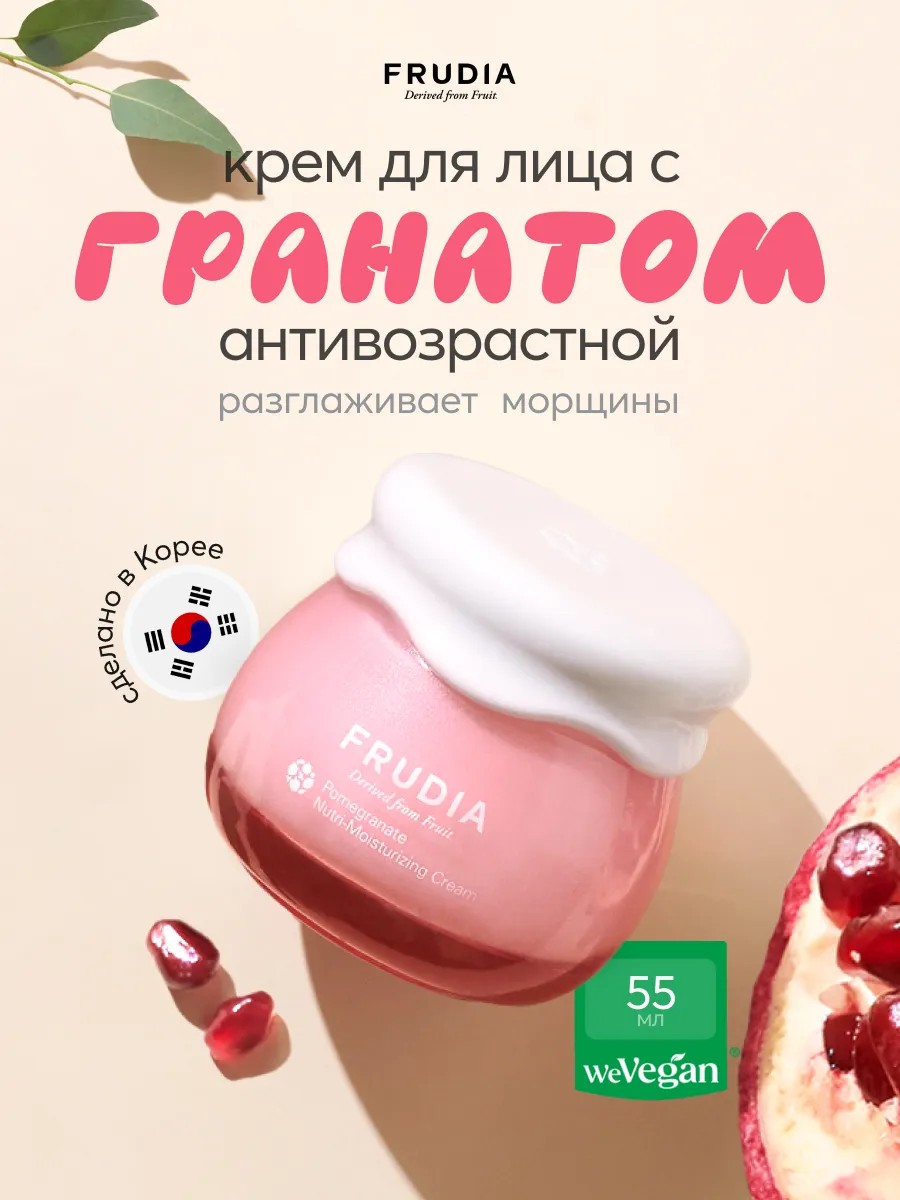 Питательный крем для лица с гранатом Pomegranate Nutri-Moisturizing Cream Frudia - это воздушная и нежная текстура суфле, мягко обволакивает кожу, питает и омолаживает. Крем на 63% состоит из экстракта граната, богатого полифенолом, который активно увлажняет и восстанавливает, повышает эластичность, разглаживает кожу, наполняя сиянием. Аденозин устраняет мелкие и глубокие морщины, а масло граната и другие масла фруктов питают и смягчают. При создании была использована уникальная технология 48 часовой низкотемпературной экстракции, что обеспечивает более глубокое проникновение в слои эпидермиса и максимальное сохранение всех полезный питательных веществ и витаминов из фруктов. Вместо воды основу крема составляет фруктовая выжимка - 63% экстракта граната, благодаря чему средство насыщено на антиоксиданты. Исключены все химические элементы, вредные для кожи, что сводит к минимуму возможность появления раздражений на коже. Крем способен глубоко напитать сухую кожу, устранить шелушения и раздражения, а также предотвратить возрастные изменения.