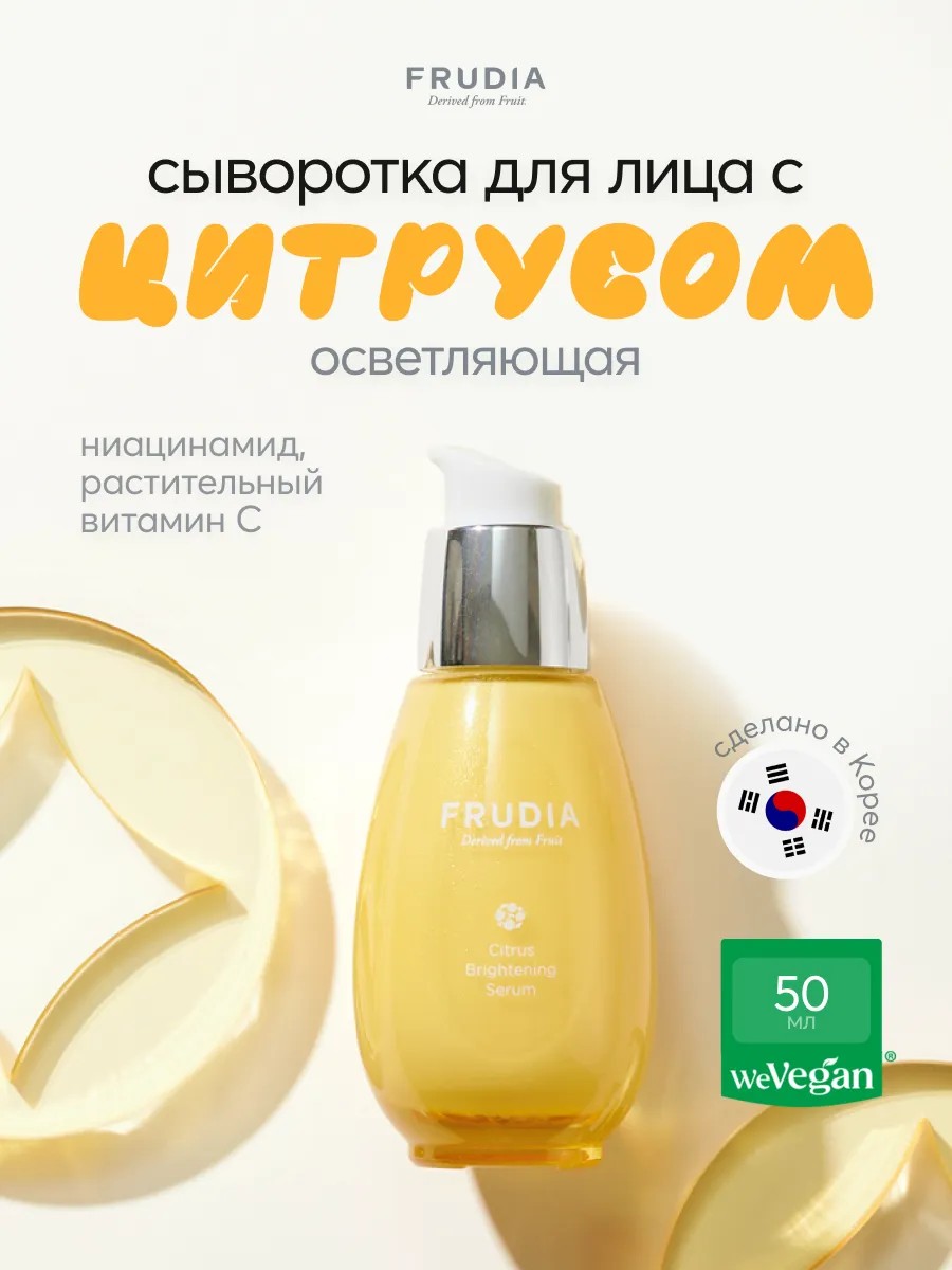 Осветляющая сыворотка с цитрусом Frudia - это витаминный коктейль для кожи. Сыворотка стирает следы усталости и стресса, оживляет уставшую кожу, борется с тусклостью и серым цветом лица. Сыворотка эффективно работает с пигментацией, осветляет кожу, выравнивает тон, придает коже красивое сияние. При регулярном использовании сыворотки кожа преображается, возвращается тонус и упругость, она становится свежей, светящейся изнутри. При создании была использована уникальная технология 48 часовой низкотемпературной экстракции, что обеспечивает более глубокое проникновение в слои эпидермиса и максимальное сохранение всех полезный питательных веществ и витаминов из фруктов. Осветляющая сыворотка на 71% состоит из экстракта цедры мандарина с острова Чеджу, она оживляет тусклую кожу, придает сияние и яркость. Ниацинамид выравнивает цвет кожи, а масло семян манго и другие ценные масла фруктов глубоко питают и смягчают.