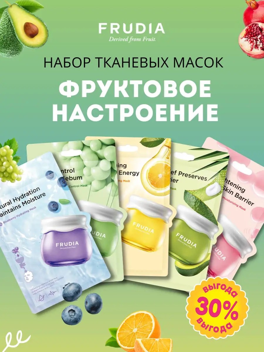 В комплект входит 5 тканевых масок для лица Фрудиа: с авокадо, цитрусом, черникой и виноградом. Состоящий на 62% из экстрактов фруктов, крем-йогурт бережно заботится о сухой и поврежденной коже, формируя защитный барьер. Пантенол активно восстанавливает, а мадекассосид и другие растительные экстракты успокаивают проблемную кожу. Крем с натуральным составом подойдет и для чувствительной кожи.