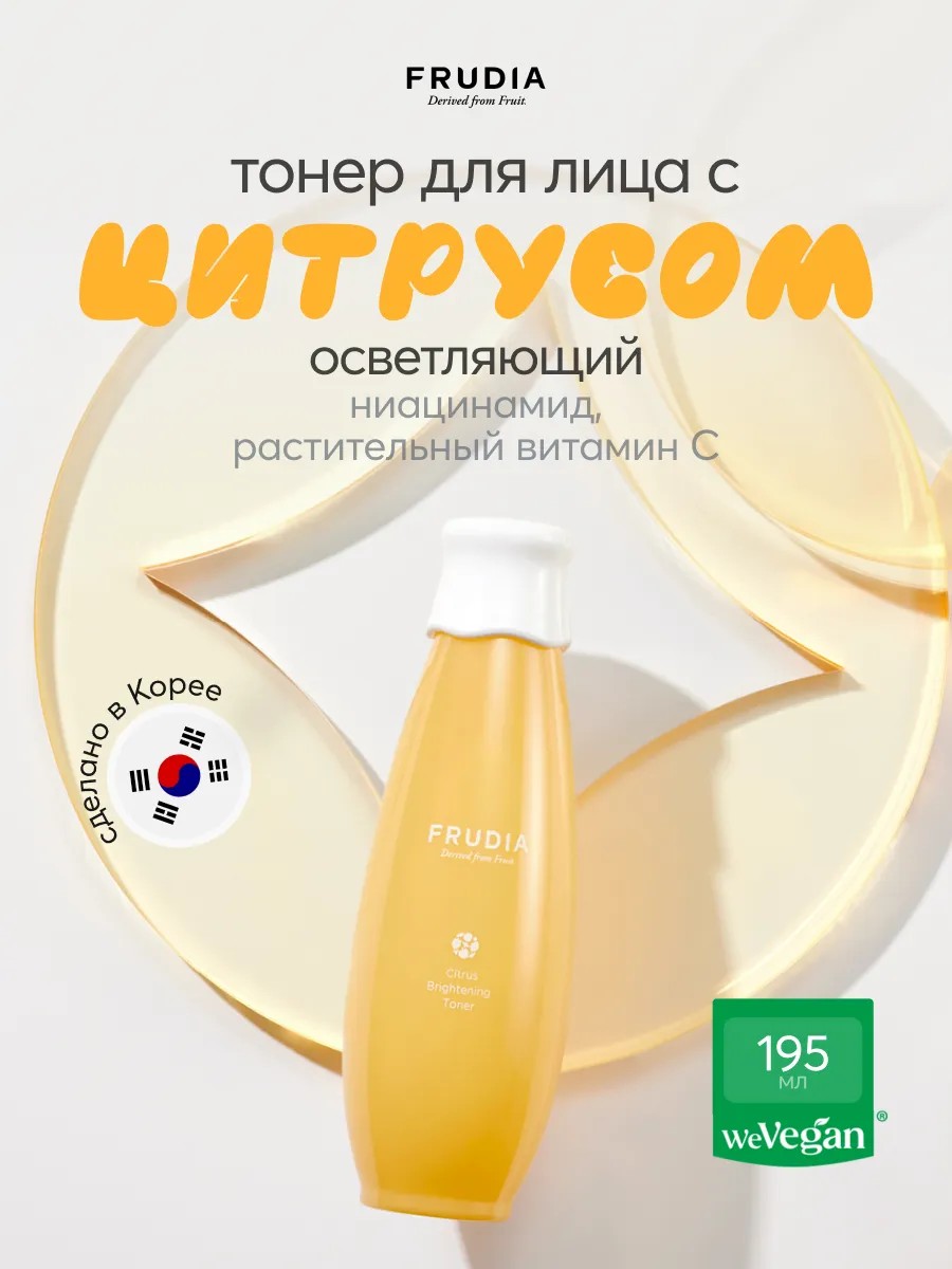 Тонер для лица с экстрактом цитруса FRUDIA CITRUS BRIGHTENING TONER отлично освежает кожу, стирает следы усталости, борется с тусклостью и серостью кожи, выравнивает тон и активно осветляет нежелательную пигментацию. Нормализует рН баланс после умывания, подготавливает эпидермис к дальнейшему уходу. В состав тонера входит экстракт цитруса (86%), который славится высоким содержанием витамина С, эффективно осветляет кожу, интенсивно работает с ее тоном, придает здоровое сияние. Насыщает эпидермис витаминами, борется со свободными радикалами. В состав тонера входит ниацинамид, он заботится о водно-жировом балансе кожи, успокаивает и увлажняет эпидермис, эффективно осветляет пигментацию и постакне, борется с воспалениями, способствует их скорейшему заживлению. У тонера легкая, водичковая текстура, быстро впитывается и не утяжеляет кожу.