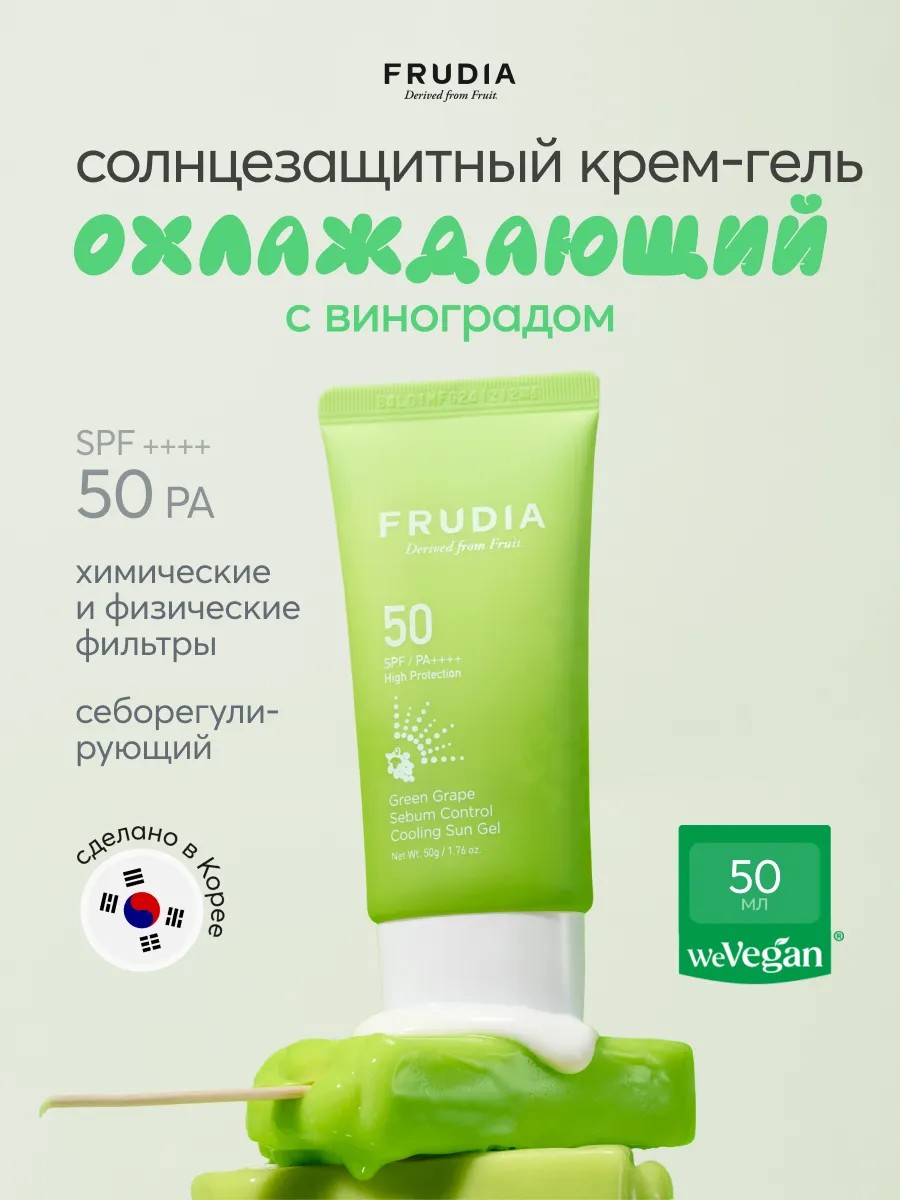 Себорегулирующий солнцезащитный крем-гель с зеленым виноградом FRUDIA SPF50+ PA+ - для жиркой и комбинированной кожи лица это идеальное средство для надежной защиты кожи от неблагоприятного воздействия ультрафиолетовых лучей. Благодаря высокому фактору защиты SPF50 и PA+, он обеспечивает высокую степень протекции от UVA и UVB лучей, предотвращая возникновение солнечных ожогов и преждевременное старение кожи. Крем содержит химические и физические фильтры, что обеспечивает высокую защиту и делает его комфортным для ежедневного использования. Нежная кремовая консистенция отлично впитывается без липкости и жирной пленки. Это отличное решение для тех, кто ищет эффективное солнцезащитное средство, не утяжеляющее кожу. Санскрин не выбеливает, оставляет естественный финиш с легким сиянием. Подходит для использования под макияж.