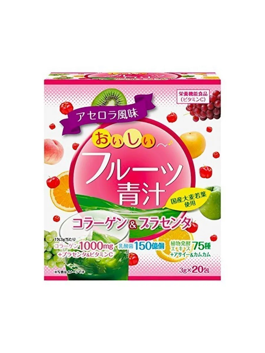 This is a fruity aojiru with acerola flavor, collagen, and placenta — a drink for beautiful skin, hair, and nails.