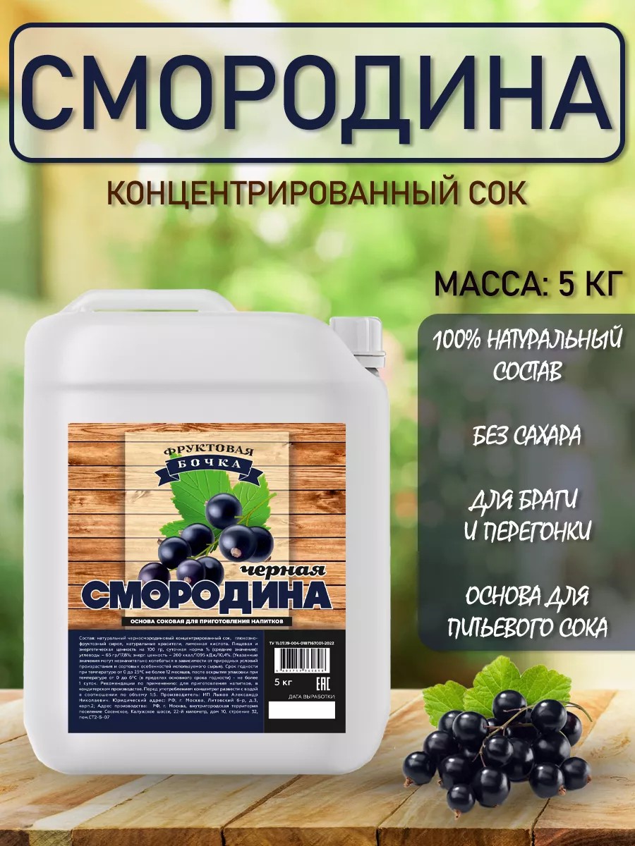 Concentrated juice (juice base) for drinks "Blackcurrant", 5 kg Natural concentrate of blackcurrant juice. Ready to drink in diluted form. Ideal for the preparation of: - strong alcoholic beverages by fermentation and distillation; - soft drinks based on juice; - can be used in siphons; - indispensable in cooking A completely natural product. Directions for use: - for drinking in diluted form, dilute with water in a ratio of 1:5 - strong alcoholic beverages - for fermentation, dilute with water in a ratio of 1:5, if necessary, add dextrose concentrate (or dextrose or sugar). It is recommended to use no more than 1 kg of additional sugars per 1 package of concentrate. Ferment with fruit alcohol yeast, distill on home distillation equipment; - for use in siphons, dilute like any syrup.