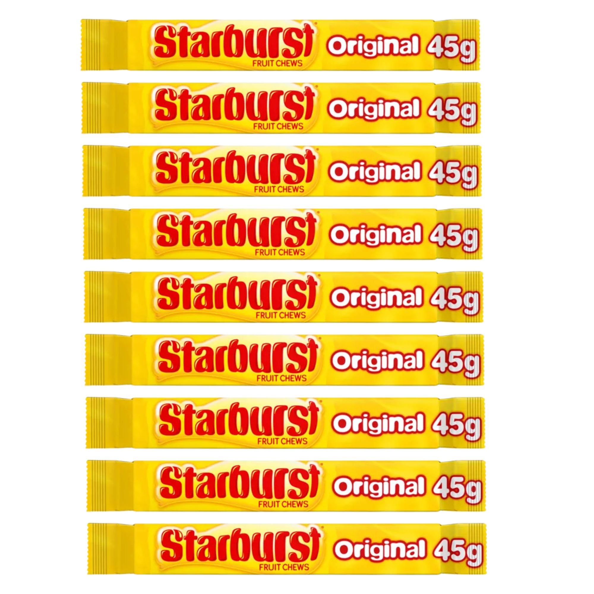 Fruit Chews Bundle with Original Starburst (Opalfruits) 45g - 9 Packs INGREDIENTS Glucose Syrup, Sugar, Palm Fat, Concentrated Fruit Juices 1.4 (Apple, Orange, Blackcurrant, Strawberry, Lime, Lemon), Acid (Citric Acid), Modified Starch, Acid (Malic Acid), Dextrin, Flavourings, Maltodextrin, Antioxidant (Ascorbic Acid), Emulsifier (Lecithin), Colours (Anthocyanins, Beta-Carotene), Spirulina Extract, Equivalent to 11.5 Fruit JuicePerfect for Gifting: Surprise someone special with this delightful Fruit Chews Bundle. Packed with the timeless goodness of Original Starburst, it makes a thoughtful and tasty gift for birthdays, holidays, or any occasion that calls for a touch of sweetness. Shareable Fun: Bring people together with the shareable joy of our Fruit Chews Bundle. Whether you're hosting a movie night, attending a party, or simply sharing with friends and family, these packs are perfect for spreading smiles and creating sweet memories. Classic Starburst Quality: Experience the iconic taste of Original Starburst in every chew. Made with high-quality ingredients, these fruit-flavored treats are known for their vibrant colors, juicy texture, and mouthwatering taste. Treat yourself to a nostalgic and delicious candy experience. Convenient On-the-Go Snacking: With 9 packs of individually wrapped Fruit Chews, our bundle is perfect for busy lifestyles. Slip a pack into your bag, purse, or pocket, and savor the sweet and tangy goodness whenever and wherever your cravings strike. Irresistible Flavor Variety: Enjoy a burst of fruity goodness with our Fruit Chews Bundle featuring Original Starburst in 45g packs. Indulge in a delightful mix of flavors, including strawberry, lemon, orange, and cherry, ensuring a satisfying treat for every taste bud.