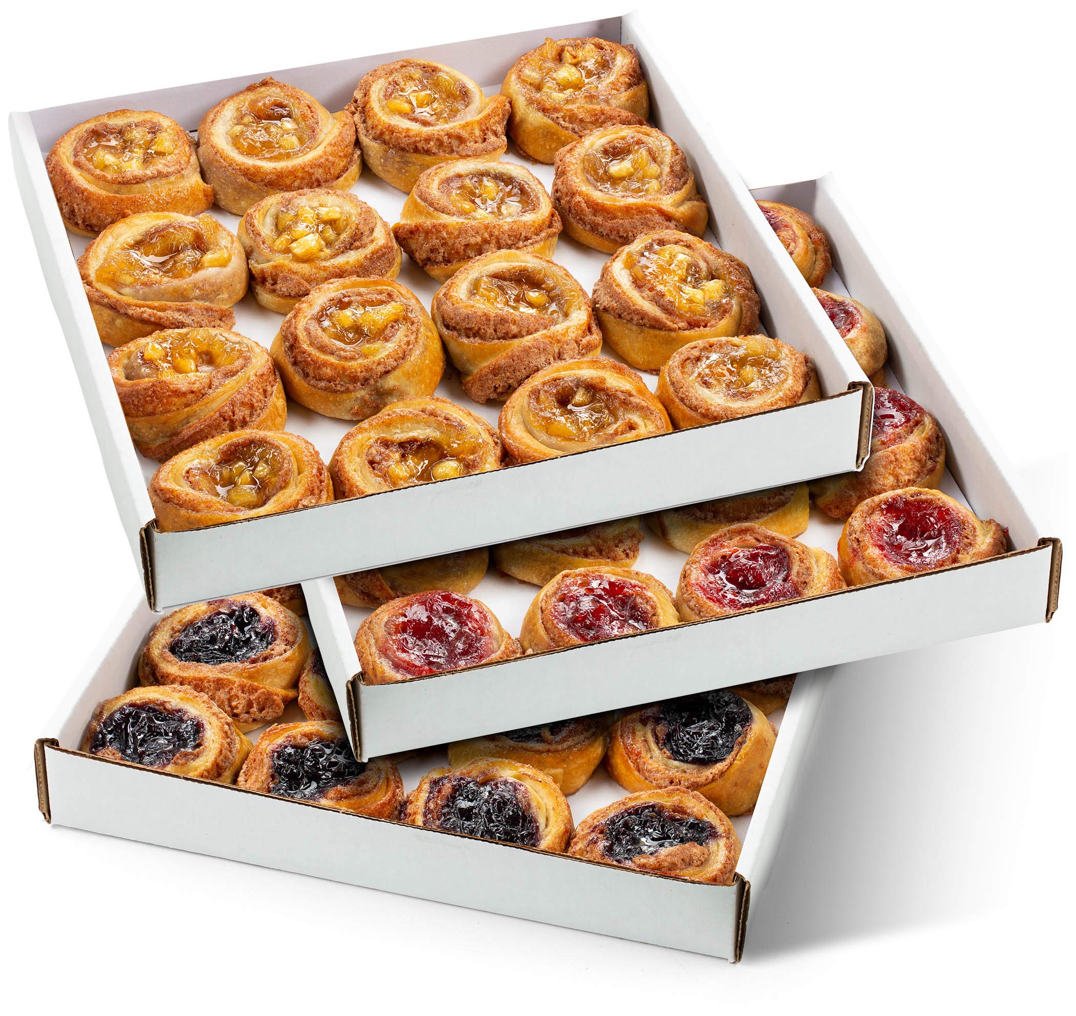 Dig into these delicious mini fruit danishes. Each danish is filled to the brim with a scrumptious fruit filling. We have them in a variety of flavors- apple, cherry and blueberry. Each flavor has its own unique deliciousness. They can also be used a complementary dessert or you can send them as a gift. They are Kosher certified by the OK and CRC and packaged to perfection to ensure their safe arrival. There are 16 fruit danish pastries per tray. Try us today and buy us with confidence!