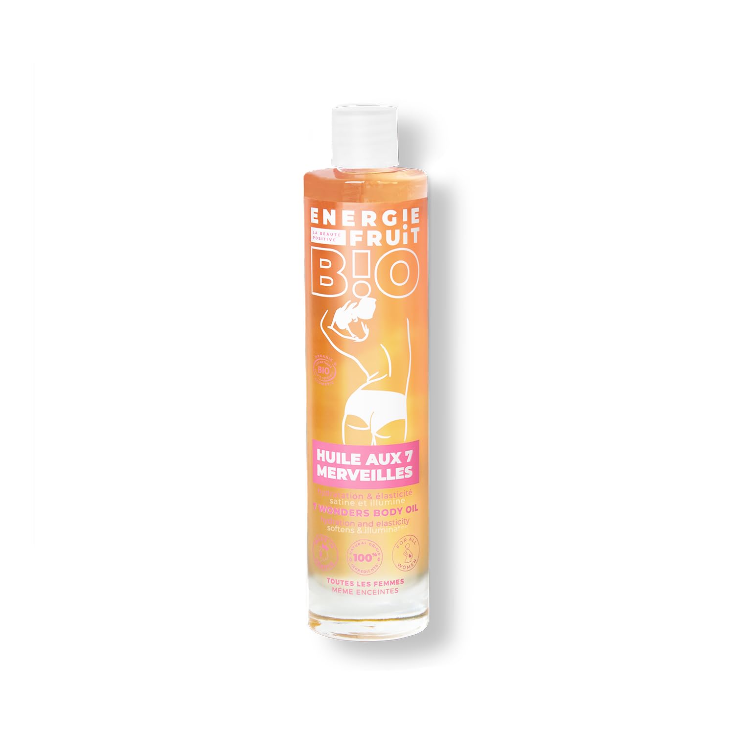 Our organic 7 wonders oil with adapted pH - suitable for pregnant women - is an oil for you and for your body to feel good, to feel beautiful. It accompanies you in all stages of your life as a woman. Its formula enriched with 7 vegetable oils, gives it multiple virtues such as hydrating the skin but also fighting against the appearance of marks. INGREDIENTS Helianthus Annuus Hybrid Oil (Helianthus Annuus (Sunflower) Seed Oil) , Limnanthes Alba (Meadowfoam) Seed Oil, Adansonia Digitata Seed Oil , Linum Usitatissimum (Linseed) Seed Oil, Olea Europaea (Olive) Fruit Oil, Prunus Amygdalus Dulcis (Sweet Almond) Oil, Parfum (Fragrance), Borago Officinalis Seed Oil, Tocopherol, Helianthus Annuus (Sunflower) Seed Oil SAFETY WARNING external use only ? VEGAN AND PROUD OF IT: The Energie Fruit brand is PETA certified, all our products are vegan and not tested on animals, which we love. ? MADE IN FRANCE: All Energie Fruit brand products are made in France with lots of love and natural products, in the south where the cicadas sing, near Aix en Provence. ? 0 SUPERFLUOUS: Dermatologically tested and certified ORGANIC by Ecocert, suitable for all skin types and all women, even pregnant women! ? PH SUITABLE FOR PREGNANT WOMEN: A formula concocted with love that is also suitable for pregnant women. It accompanies you in all stages of your life as a woman. This dry oil enriched with 7 vegetable oils such as linseed oil or baobab oil deeply nourishes the skin and prevents the marks of life. Immediately absorbed, it leaves a satiny effect on the skin, for a healthy glow. An oil that gives you time to feel like a woman, to feel good, in short, to be beautiful! ? ECOCERT ORGANIC AND NATURAL CERTIFIED PRODUCT: This oil is made from 100 natural ingredients and certified ORGANIC by Ecocert. Our vegan formula is made from 7 vegetable oils with different benefits for you and your body. A formula concocted with love that is also suitable for pregnant women. Notre huile aux 7 merveilles BIO au ph adapté - qui convient aux femmes enceintes est une huile pour vous et pour votre corps pour vous sentir bien, vous sentir belle. Elle vous accompagne dans toutes les étapes de votre vie de femme. Sa formule enrichie de 7 huiles végétales, lui profère de multiples vertus comme l'ydratation de la peau mais aussi la lutte contre l'apparition des marques. INGRÉDIENTS Helianthus Annuus Hybrid Oil (Helianthus Annuus (Sunflower) Seed Oil) , Limnanthes Alba (Meadowfoam) Seed Oil, Adansonia Digitata Seed Oil , Linum Usitatissimum (Linseed) Seed Oil, Olea Europaea (Olive) Fruit Oil, Prunus Amygdalus Dulcis (Sweet Almond) Oil, Parfum (Fragrance), Borago Officinalis Seed Oil, Tocopherol, Helianthus Annuus (Sunflower) Seed Oil AVERTISSEMENT DE SÛRETÉ usage externe uniquement ? VEGAN ET FIERE DE L'ÊTRE: La marque Energie fruit est certifiée PETA, tous nos produits sont vegans et non testés sur les animaux, que l'on aime d'amour. ? MADE IN FRANCE: Tous les produits de la marque Energie Fruit sont fabriqués en France avec plein d'amour et des produits naturels, dans le sud où chantent les cigales, près d'Aix en Provence. ? 0 SUPERFLU : Testée dermatologiquement et certifiée BIO par écocert convient à tous les types de peaux et à toutes les femmes même enceintes!. ? PH ADAPTE AUX FEMMES ENCEINTES : Une formule concoctée avec amour qui convient également aux femmes enceintes. Elle vous accompagne dans toutes les étapes de votre vie de femme. Cette huile sèche enrichie aux 7 huiles végétales comme l'huile de lin ou encore l'huile de baobab vient nourrir la peau en profondeur et prévenir des marques de la vie. Immédiatement absorbée, elle laisse un effet satinée sur la peau, pour un effet bonne mine. Une huile qui vous donne le temps de vous sentir femme, vous sentir bien bref vous belle !. ? PRODUIT CERTIFE BIO ECOCERT ET NATUREL : Cette huile est composée à 100 d'ingrédients d'origine naturelle et certifié BIO par Ecocert. Notre formule végan et composée par 7 huiles végétales aux différentes vertus pour toi et pour ton corps. Une formule concoctée avec amour qui convient également aux femmes enceintes.