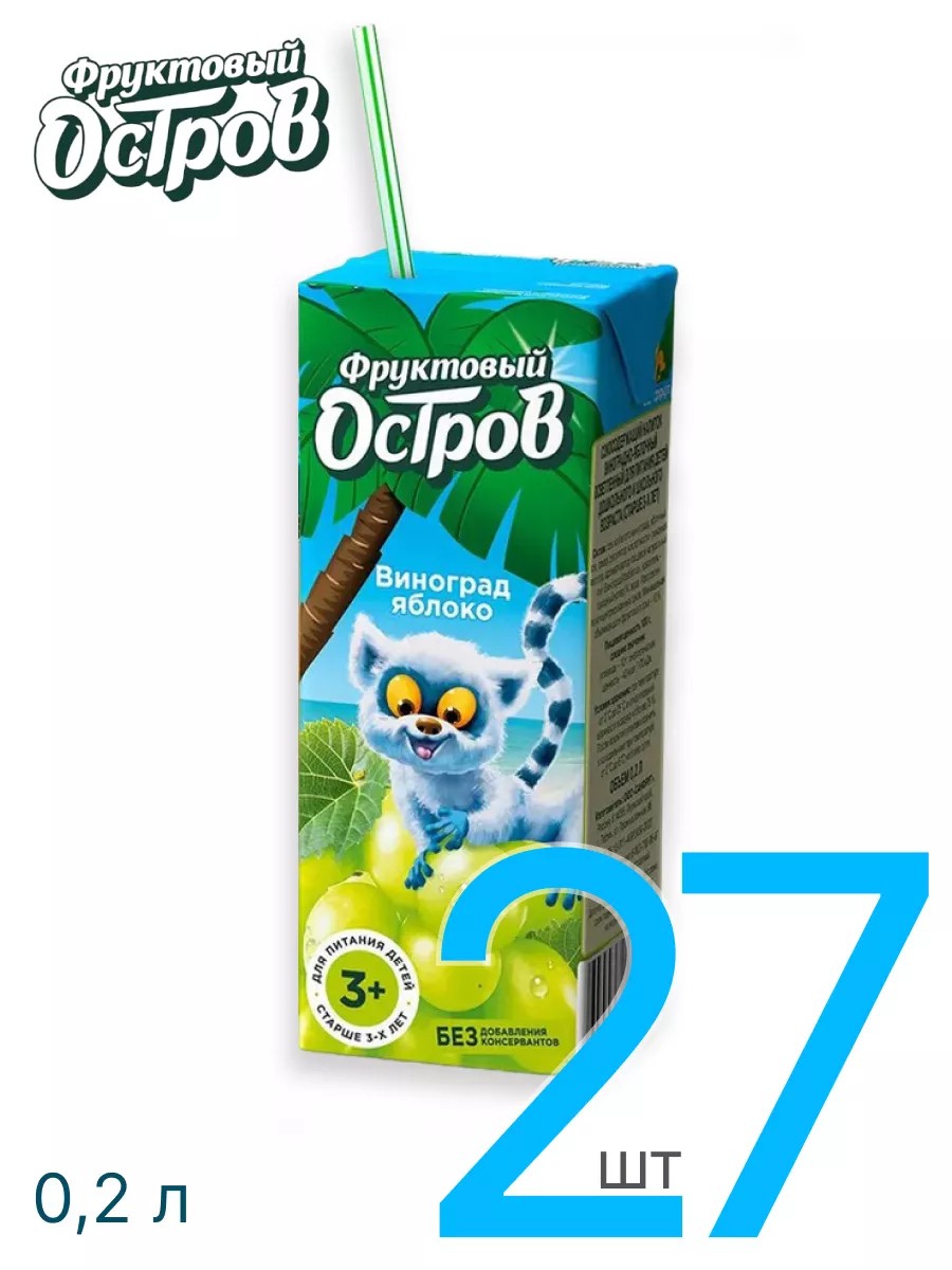 Напиток сокосодержащий детский Фруктовый остров Виноградно-Яблочный осветленный 0,2 л - 27 шт. Со вкусом спелых яблок и сочного винограда. Рекомендован для питания детей от 3-х лет. Мы знаем, как важно выбирать продукты, которые будут и вкусными и полезными для вашего ребенка! Наш сок специально разработан с учетом потребностей маленьких гурманов. Мы используем только самые свежие и натуральные фрукты и ягоды, чтобы каждый глоток сока приносил радость Вашему малышу. Ведь ребенок заслуживает только самого лучшего! Сок детский не только красиво выглядит - он еще и приносит огромную пользу вашему малышу! Благодаря витаминам и микроэлементам, содержащимся в каждом стаканчике, напиток с соком для малыша укрепляет иммунную систему, способствует правильному развитию организма и обеспечивает энергией на целый день игр и забав. «Фруктовый остров» - яркий российский бренд нектаров и сокосодержащих напитков. «Фруктовый остров» - это высокое качество и отличные вкусы, которые придутся по душе взрослым и детям. Классические и уникальные вкусы по доступной цене. Детский дизайн формата 0,2 л: добрые и яркие персонажи животных и птиц на упаковках делают ее привлекательной для детей и их родителей, а удобная трубочка поможет наслаждаться напитком без проблем. Отличный вкус БЕЗ консервантов, ГМО и искусственных красителей. Среди моря соков есть «Фруктовый остров»! Условия хранения: При температуре от 0˚С до 25˚С и относительной влажности воздуха не более 75 %. После вскрытия упаковки хранить в холодильнике при температуре от 2˚С до 6˚С не более суток. СОСТАВ: Сок из белого винограда, яблочный сок, сахар, регулятор кислотности - лимонная кислота, ароматизатор пищевой натуральный «тип Виноград Изабелла», краситель - сахарный колер IV, вода. Производитель оставляет за собой право изменять дизайн упаковки.