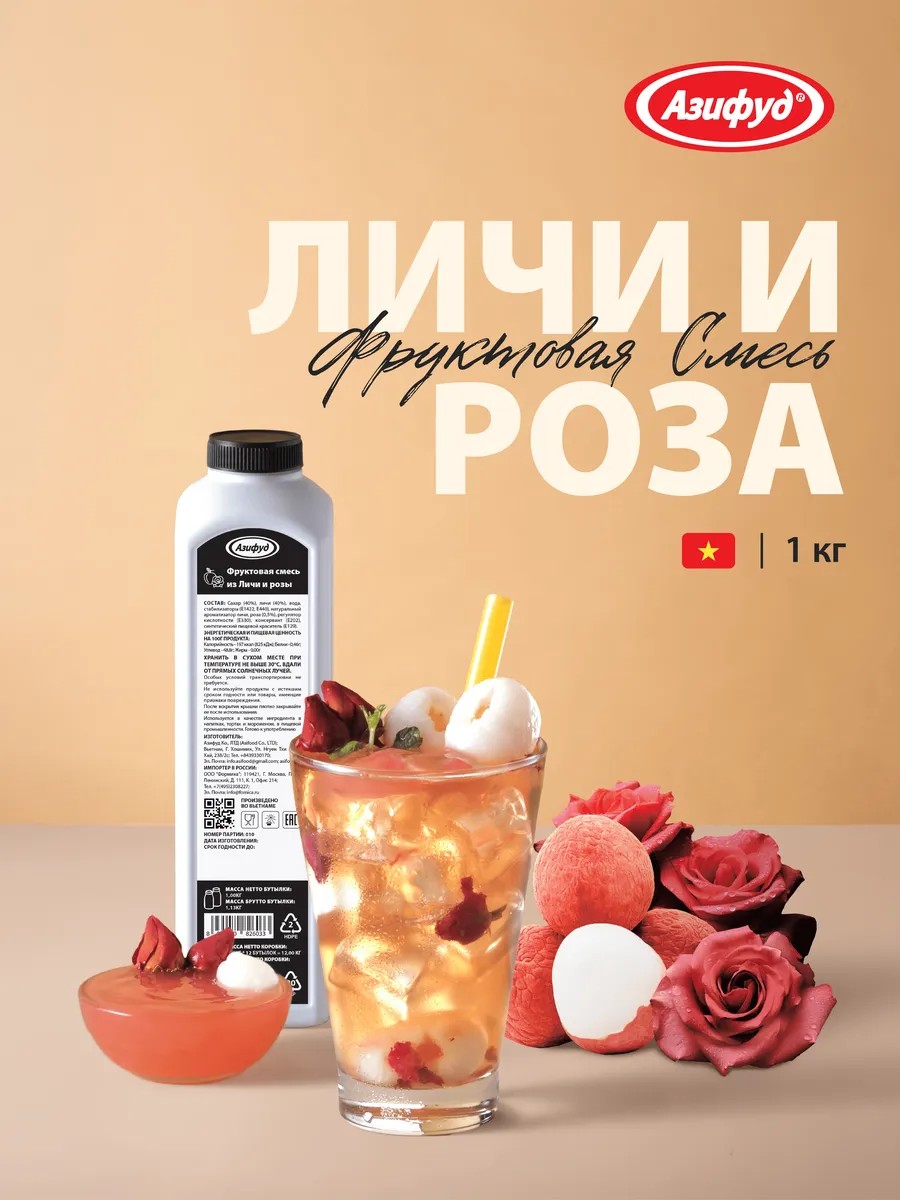 | Состав | сахар; личи; вода; стабилизаторы; натуральный ароматизатор личи; роза; регулятор кислотности; консервант; синтетический пищевой краситель |