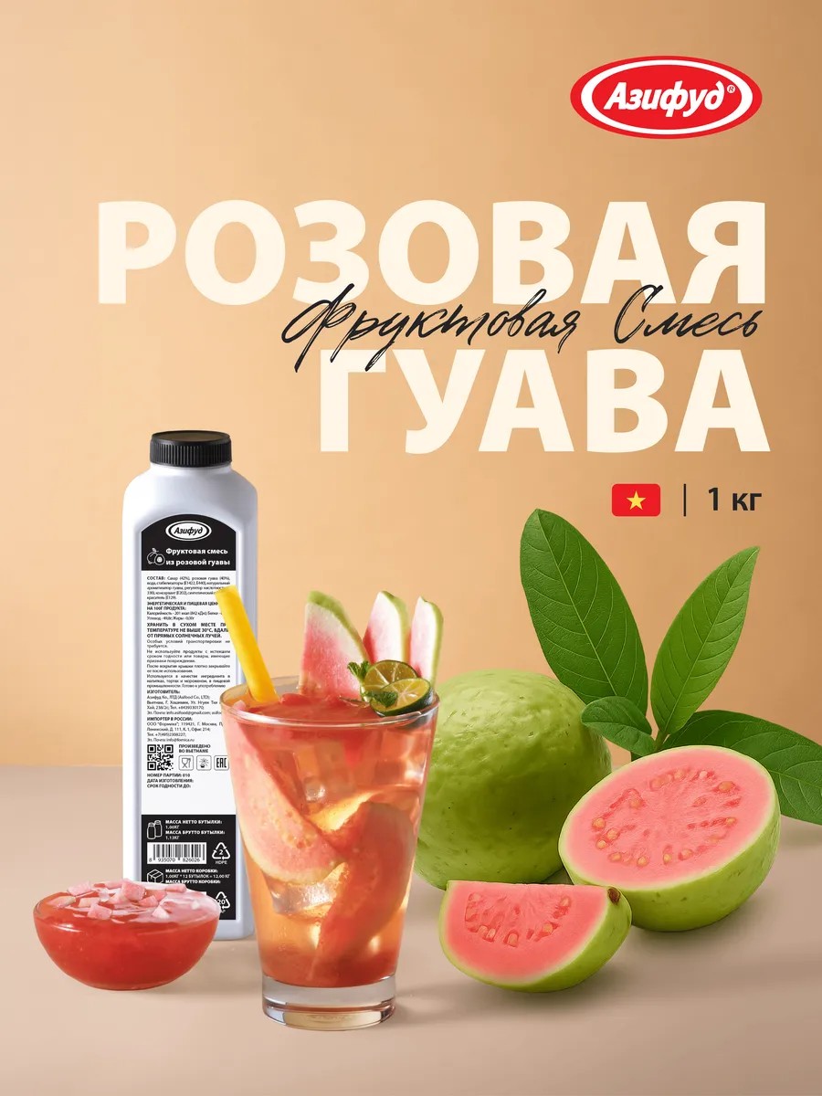 | Состав | сахар; розовая гуава; вода; стабилизаторы; натуральный ароматизатор гуавы; регулятор кислотности; консервант; синтетический пищевой краситель |