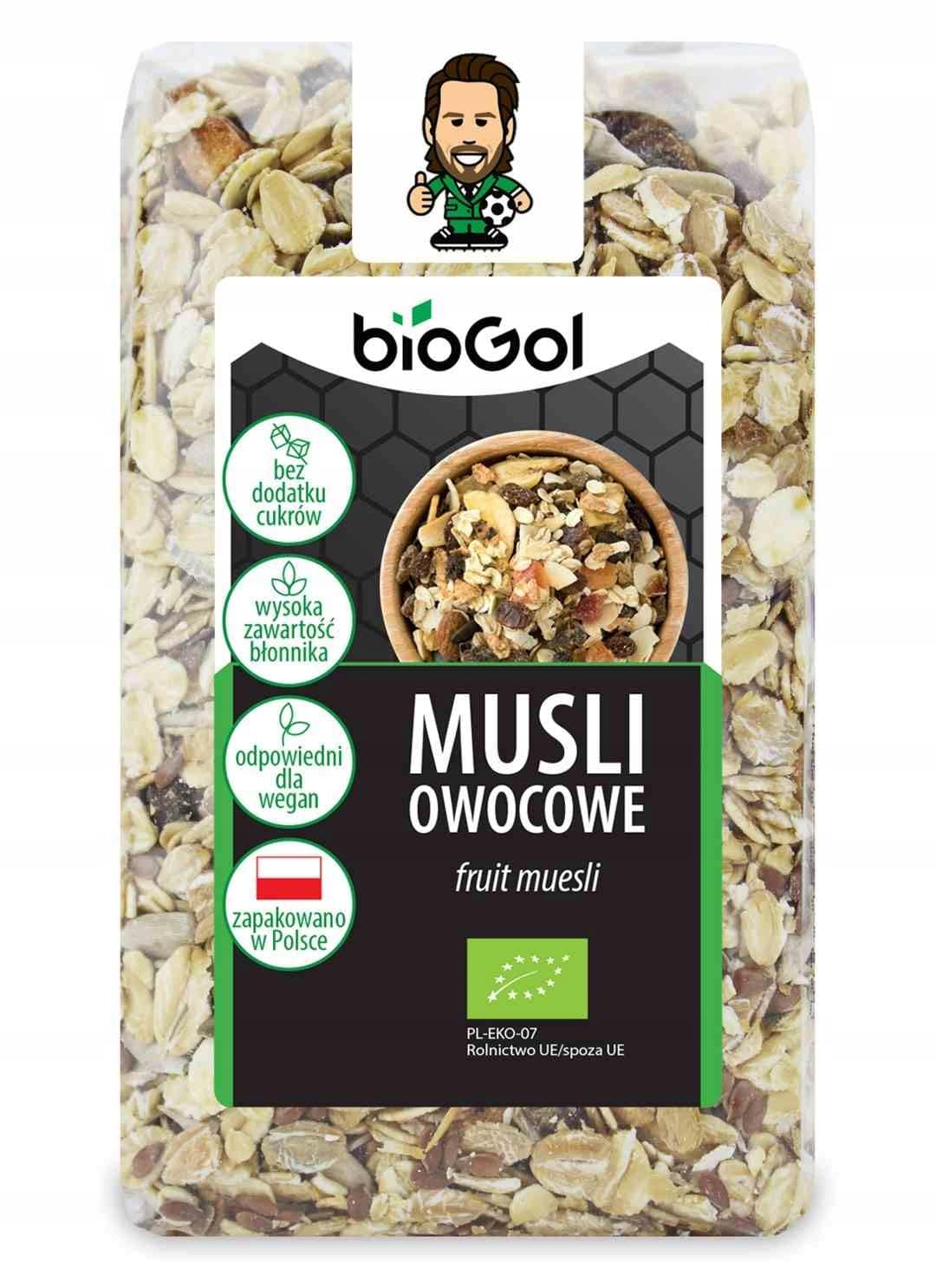 Ingredients: oat flakes, rye flakes, sultanines, raisins, oranges, sunflower oil, dried fruits, apricots, figs, apples, rice flour, linseed, barley flakes, sunflower, (certified organic ingredient). : We recommend that the muesli be given a short-term heat treatment before use. Nutritional value per 100 g energy value - 1496 kJ 356 kcal fat - 7.8 g including saturated fatty acids - 1.0 g carbohydrates - 54 g including sugar - 19 g fiber - 13 g protein - 11 g salt - 0.03 g It contains naturally occurring sugar. Allergy Formats: The product may contain allergens: grains containing gluten, peanuts, other tree nuts, sesame and soy. Recommended storage conditions: Store in a dry, cool place. Manufacturer - Name and address: GK4 INVESTMENT SP. Z O. O., Wojska Polskiego 13, 72-320 Trzebiatów.FRUIT MUSELS BIO 300 g - BIOGOL Ingrediënten: havervlokken, roggevlokken, sultanines, rozijnen, sinaasappels, zonnebloemolie, gedroogde vruchten, abrikozen, vijgen, appels, rijstmeel, lijnzaad, gerstevlokken, zonnebloem, (gecertificeerd biologisch ingrediënt). : wij raden aan om de muesli vóór gebruik een kortstondige warmtebehandeling te onderhouden. Voedingswaarde per 100 g energiewaarde - 1496 kJ 356 kcal vet - 7,8 g inclusief verzadigde vetzuren - 1,0 g koolhydraten - 54 g inclusief suiker - 19 g vezel - 13 g eiwit - 11 g zout - 0,03 g Het bevat natuurlijk voorkomende suiker. Allergie-formaten: het product kan allergenen bevatten: granen dat gluten, pinda's, andere noten, sesam en soja bevat. Aanbevolen opslagvoorwaarden op een droge, koele plaats bewaren. Fabrikant - Naam en adres: GK4 INVESTMENT SP. Z O. O., Wojska Polskiego 13, 72-320 Trzebiatów.