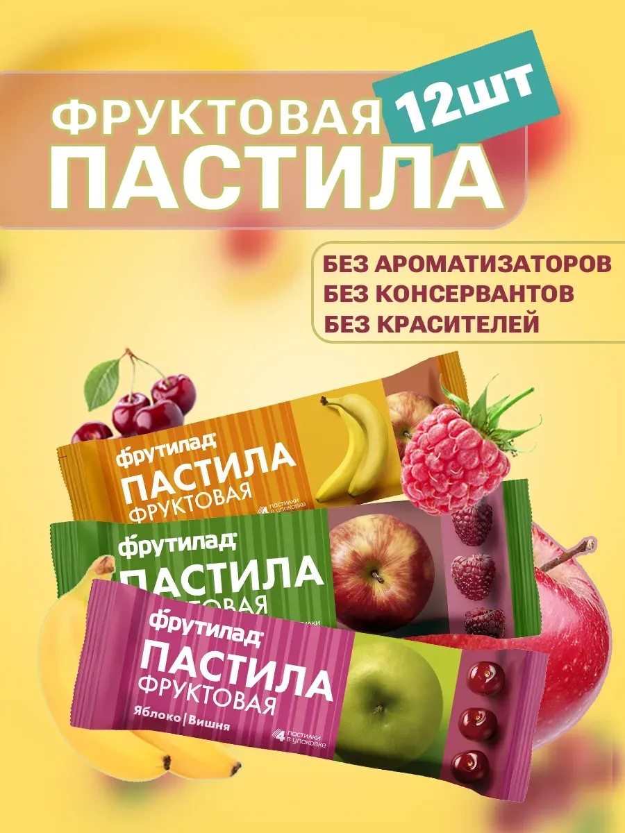 3 popular flavors of pastila in one showbox: no preservatives, no flavors, no added sugar. Contains only natural sugars. Suitable for vegetarians. An excellent substitute for fruit, cereal, and chocolate bars. A healthy treat in a convenient format. One package contains 4 delicious pastilas. The box contains 12 pieces: Apple-Cherry - 4 pcs. (Ingredients: applesauce, fresh-frozen cherries). Banana-Apple - 4 pcs. (Ingredients: banana puree, applesauce). Apple-Raspberry - 4 pcs. (Ingredients: applesauce, fresh-frozen raspberry juice).