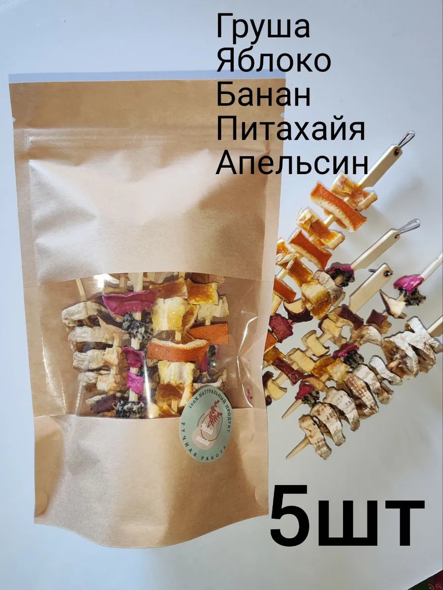 Фруктовые шашлычки — это полезная и вкусная добавка к основному рациону птиц и мелких грызунов, состоящая из пяти видов сушеных фруктов: питахайя, банан, груша, яблоко, апельсин. Благодаря своему разнообразному составу, лакомство послужит дополнительным источником витаминов и других полезных веществ, а также окажет положительный эффект на обмен веществ, нервную систему и тонус организма Ваших питомцев. Витаминно-минеральный комплекс в составе фруктов придаст блеск шерсти, перьям и улучшит общее состояние животного, делая его активным и здоровым. Наш набор — это бережно высушенные кусочки фруктов на буковых шпажках длинной 15см. На каждой шпажке прикреплён металлический карабин, для удобного размещения в клетке. Сушеные фрукты являются источником полезных веществ, минералов и витаминов для мелких грызунов таких как хомяки, мыши, крысы тушканчики, белки, и т.д. Употребление высушенных фруктов нормализует работу пищеварительной системы мелких грызунов и птиц таких, как Какаду, Ара, неразлучники, волнистые попугаи, канарейки и др. Фрукты – полезное лакомство, от которого Ваш любимый питомец не сможет отказаться. Высушенными фруктами кормят питомцев не уходтолько с целью утолить голод, но и для профилактики авитаминозов. Они являются вкусным прикормом или дополнением к основному корму для мелких грызунов, таких как: морских свинок, суркам, песчанкам, шиншиллам, нутрии, хорькам, дикобразам для различных видов хомяков и т.д., попугаев мелких, средних и крупных пород, канареек и т.д. Фруктовые шашлычки поставляются в упаковочных крафтовых пакетах.