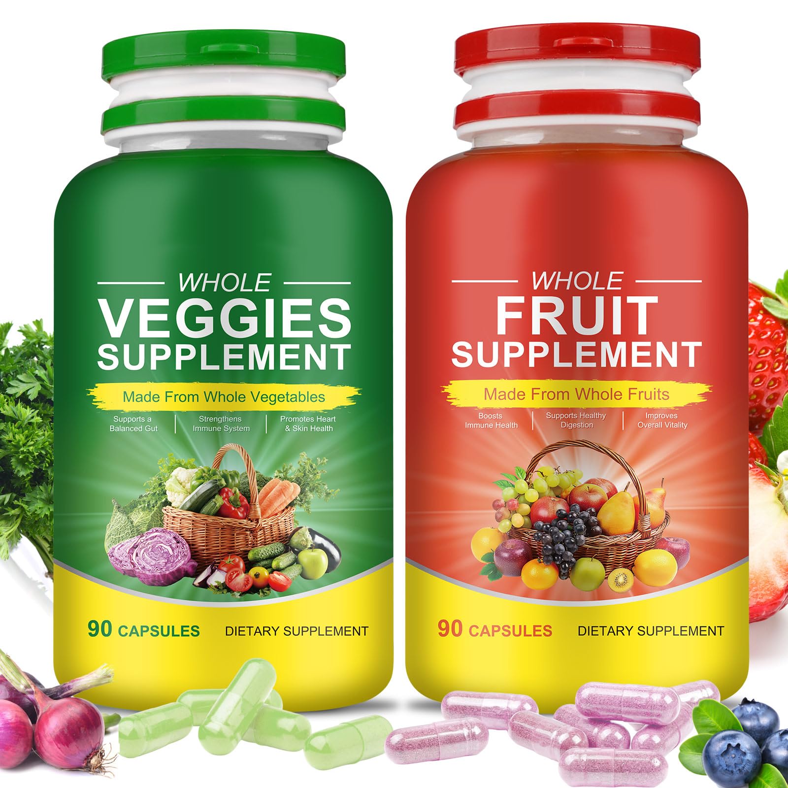 Balance Whole Food Supplement with Fruit and Vegetable IngredientsHelp Support Natural Energy - Our all natural fruit and veggies supplement was made with the fruit and vegetable vitamins your body craves to help enjoy life.Made with Over 40 Fruits Veggies. Soy- Free , Doubled Sealed Freshness - Our super foods supplements are Vegan, Non-GMO, Gluten-Free. contains No pesticides or added preservatives. Plus, each bottle is double sealed for your protection and peace of mind. 100 soy free!. Fruits and Veggies - Balance fruit and vegetables capsules.Contain amounts of most of the daily recommended fruits and vegetables. All natural fruit and vegetables are an ideal choice for those seeking to embrace a healthier and more joyful life are an ideal choice for those seeking to embrace a healthier and more joyful life. Whole Food fruits and vegetables Supplements: more fruits and vegetables - aloe vera, cranberry, broccoli, cabbage, carrot, cauliflower, pepper, celery stem, garlic, kale, onion, mushrooms, spinach, sweet potato, wheat grass, zucchini, apple, banana, blueberry, cherry, cranberry, grape, grapefruit, lemon, mango, orange, papaya, pineapple, raspberry, strawberry, tomato, beet root, bamboo extract, green olive leaf, grape seed, pomegranate, green tea, blueberry, white grape, red grape and orange. Our whole food vitamin supplements - that use extracts from vegetables and fruits are made using only vegan and pure ingredients without relying on any artificial additives or harsh chemicals,support the body, maintain energy levels, promote softer skin, and aid the immune system while being gentle on the digestion for daily use.