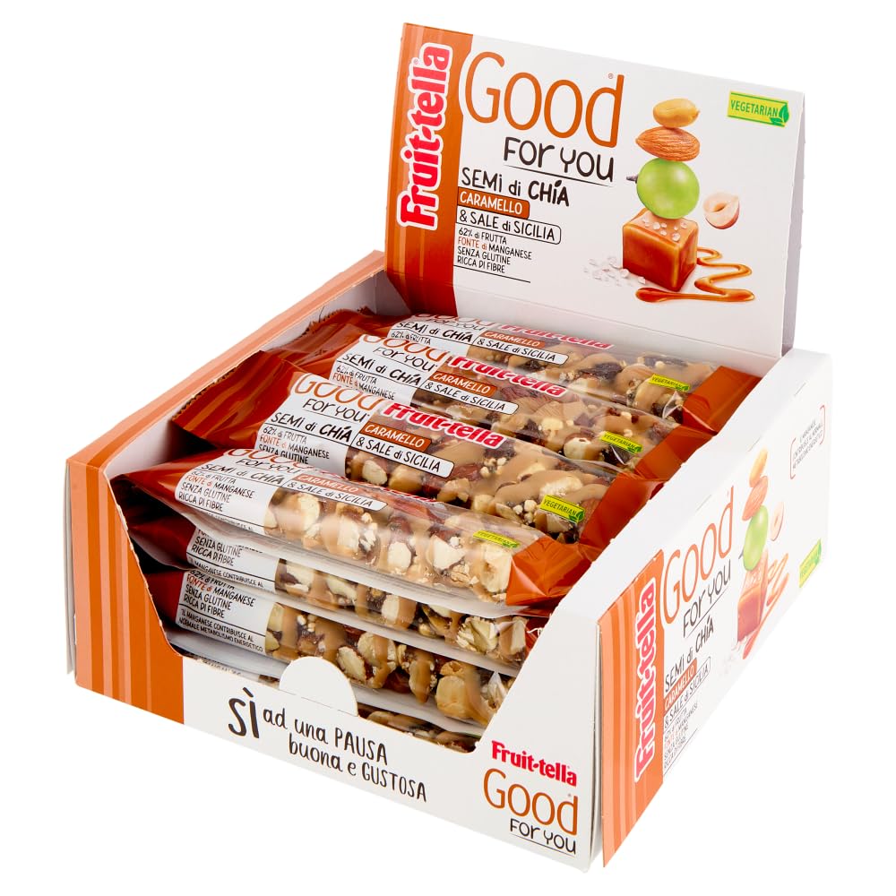 Dried and dehydrated chocolate-coated fruit bar. Gluten-free. Ingredients: Dried fruit (5096) (almonds, walnuts, roasted peanuts), glucose syrup, white caramel-flavored chocolate (13 ) (cocoa butter, sugar, whole milk powder, crushed milk powder, caramelized sugar, emulsifier (soy lecithin), Sauveetta (12 ) (raisins, cottonseed oil), chia seeds (Sage Hispanica) (2 ), honey, inulin, puffed white quinoa, coconut oil, Sicilian salt (0.3 ), dark chocolate (0.2 ) (cocoa mass, sugar, cocoa butter, emulsifier (soy lecithin), flavoring), salt), salt, cocoa butter, emulsifier (lecithin). May contain traces of other nuts. Not suitable for children under 5 years: choking hazard. The product may contain isolated shell fragments. Store in a cool, dry place away from heat sources.16 Barrette Fruit Good For You Graines de Chia Caramel et Sel de Sicile 36 gDESCRIPTION DU PRODUIT Barrette de fruits secs et déshydratée au chocolat. Sans gluten, Ingrédients : fruits secs (5096) (MANDORLE, NOCCIOLE, ARACHIDI grillé), sirop de glucose, chocolat blanc goût caramel (13 ) (beurre de cacao, sucre, lait entier en poudre, lait écrasé en poudre, sucre caramellisé, émulsionnant (lécithine de SOIA), Sauveetta (12 ) (raisin, huile de graines de coton), graines de chia (Sauge hispanique) (2 ), miel, inuline, quinoa blanc soufflé, huile de coco, sel de Sicile (0,3 ), chocolat fondant (0,2 ) (pâte de cacao, sucre, beurre de cacao, émulsifiant (lécithine de SOIA), arôme), sel), sel, beurre de cacao, emulsifiant (lécitine). Peut contenir des traces d'autres fruits à la coque. Ne convient pas aux enfants de moins de 5 ans : risque d'étouffement. Le produit peut contenir des fragments de coquille isolés. Conserver dans un endroit frais et sec, loin de sources de chaleur.