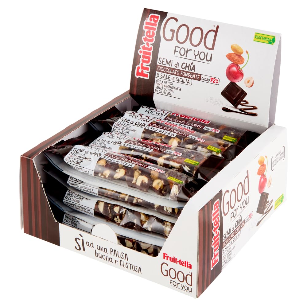Fruittella Bar - Good For You - Chia Seeds - Dark Chocolate and Sicilian Salt - 16 Pieces of 36g Ingredients: Dried and dehydrated fruit bar with chocolate. Gluten-free. Ingredients: Dried fruit (50 ) (almonds, walnuts, toasted peanuts), glucose syrup, dark chocolate (14 ) (cocoa mass, sugar, cocoa butter, emulsifier (soy lecithin), flavoring), dehydrated cherries (12 ), chia seeds (Ispanic sage) (2 ), honey, inulin, puffed white quinoa, coconut oil, Sicilian salt (0.4 ), salt, cocoa butter, emulsifier (lecithin). May contain traces of milk and other nuts. Not suitable for children under 5 years: choking hazard. The product may contain isolated shell fragments. Store in a cool, dry place, away from heat sources.16 Barrette Fruit Good For You Semi Chia Chocolat Fondant Sel Sicile 36 gDESCRIPTION DU PRODUIT Barrette Fruittella - Good For You - Graines de Chia - Chocolat Fondant et Sel de Sicile - 16 Pièces de 36 g Ingrédients Barretta de fruits secs et déshydratée avec chocolat. Sans gluten. Ingrédients : fruits secs (50 ) (MANDORLE, NOCCIOLE, ARACHIDI tostat) sirop de glucose, chocolat fondant (14 ) (pâte de cacao, sucre, beurre de cacao, émulsifiant (lécithine de SOIA), arome), cerises déshydratées (12 ), graines de chia (sauge ispanique) (2 ) (2 ), miel, inuline, quinoa blanc soufflé, huile de coco, sel de Sicile (0,4 ), sel, beurre de cacao, émulsifiant (lécitititine). Peut contenir des traces de lait et autres fruits à la coque. Ne convient pas aux enfants de moins de 5 ans : risque d'étouffement. Le produit peut contenir des fragments de coquille isolés. Conserver dans un endroit frais et sec, loin de sources de chaleur.