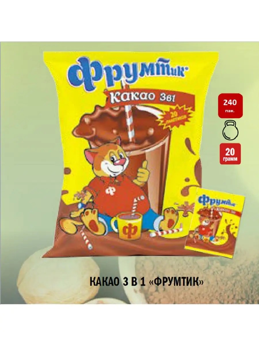 Какао-напиток Фрумтик - отличное начало дня! Удобно взять с собой и легко приготовить - просто залить водой содержимое пакетика и перемешать. Подходит взрослым и детям. Вкусный и полезный подарок к любому празднику. Изготовлен из отборных какао-бобов Южной Америки. Способ приготовления: высыпьте содержимое пакетика в чашку, добавьте 150-200 мл горячей, но не кипящей воды, перемешайте.Какао быстрорастворимый, Какао в пакетиках, Какао 3в1.