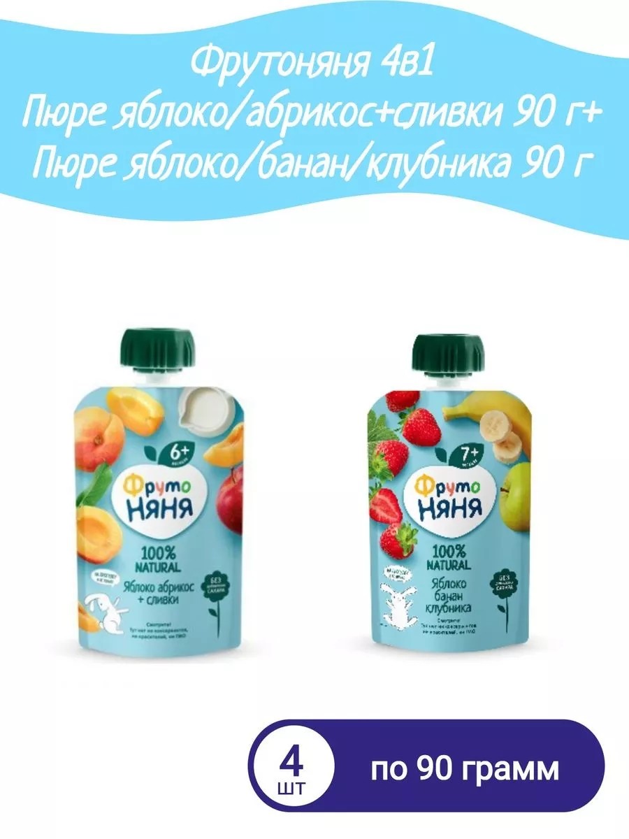 Фруктовое пюре в мягкой упаковке «ФрутоНяня» - это вкусный и полезный перекус, который удобно брать с собой, а яркая мягкая упаковка привлечет внимание Вашего малыша и позволит ему есть самостоятельно. А еще можно поиграть с Фрутокрышками! Крышки-конструкторы от упаковок фруктового пюре «ФрутоНяня» выполнены в 7-ми ярких цветах, легко соединяются между собой. Много интересных и веселых поделок можно смастерить из них вместе с мамой! Пюре «ФрутоНяня» в мягкой упаковке. Удобно использовать на прогулке, в путешествии или в гостях. Малыш сможет есть сам без ложечки под присмотром взрослых. Яркая и удобная упаковка привлечет внимание малыша и позволит ему научиться разпознавать цвета, а новые вкусы десертов разнообразят рацион питания малыша. Продукт готов к употреблению. Гомогенизированное. Стерилизованное. Рекомендации по употреблению: рекомендуется детям с 4 месяцев, начиная с 1/2 чайной ложки 2 раза в день, постепенно увеличивая к 12 месяцам до 100 г в день. Не разогревать в микроволновой печи. Не оставляйте детей без присмотра во время использования.После вскрытия продукт хранить в холодильнике не более суток.Внимание! При транспортировке может произойти нарушение герметичности упаковки. Попробуйте продукт перед кормлением ребенка. Особенности: не содержит консервантов, не содержит красителей, не содержит ГМО, гомогенизированное, гипоаллергенный продукт. Условия хранения: при температуре от 0 до +25°C, с относительной влажностью воздуха не более 75%. Беречь от солнечных лучей. Срок годности: 12 мес. Срок годности после открытия: 1 день.