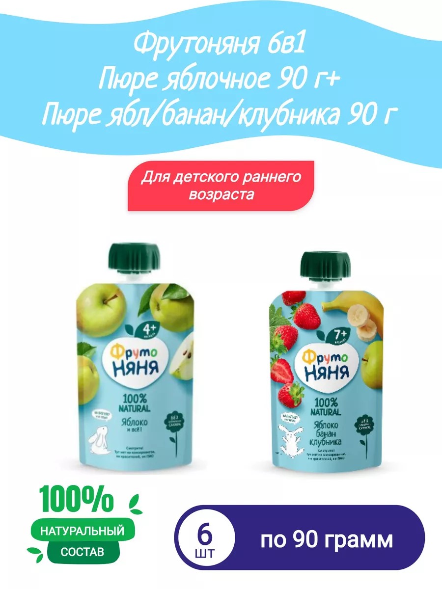 Фруктовое пюре в мягкой упаковке «ФрутоНяня» - это вкусный и полезный перекус, который удобно брать с собой, а яркая мягкая упаковка привлечет внимание Вашего малыша и позволит ему есть самостоятельно. А еще можно поиграть с Фрутокрышками! Крышки-конструкторы от упаковок фруктового пюре «ФрутоНяня» выполнены в 7-ми ярких цветах, легко соединяются между собой. Много интересных и веселых поделок можно смастерить из них вместе с мамой! Пюре «ФрутоНяня» в мягкой упаковке. Удобно использовать на прогулке, в путешествии или в гостях. Малыш сможет есть сам без ложечки под присмотром взрослых. Яркая и удобная упаковка привлечет внимание малыша и позволит ему научиться разпознавать цвета, а новые вкусы десертов разнообразят рацион питания малыша. Продукт готов к употреблению. Гомогенизированное. Стерилизованное. Рекомендации по употреблению: рекомендуется детям с 4 месяцев, начиная с 1/2 чайной ложки 2 раза в день, постепенно увеличивая к 12 месяцам до 100 г в день. Не разогревать в микроволновой печи. Не оставляйте детей без присмотра во время использования.После вскрытия продукт хранить в холодильнике не более суток.Внимание! При транспортировке может произойти нарушение герметичности упаковки. Попробуйте продукт перед кормлением ребенка. Особенности: не содержит консервантов, не содержит красителей, не содержит ГМО, гомогенизированное, гипоаллергенный продукт. Условия хранения: при температуре от 0 до +25°C, с относительной влажностью воздуха не более 75%. Беречь от солнечных лучей. Срок годности: 12 мес. Срок годности после открытия: 1 день.