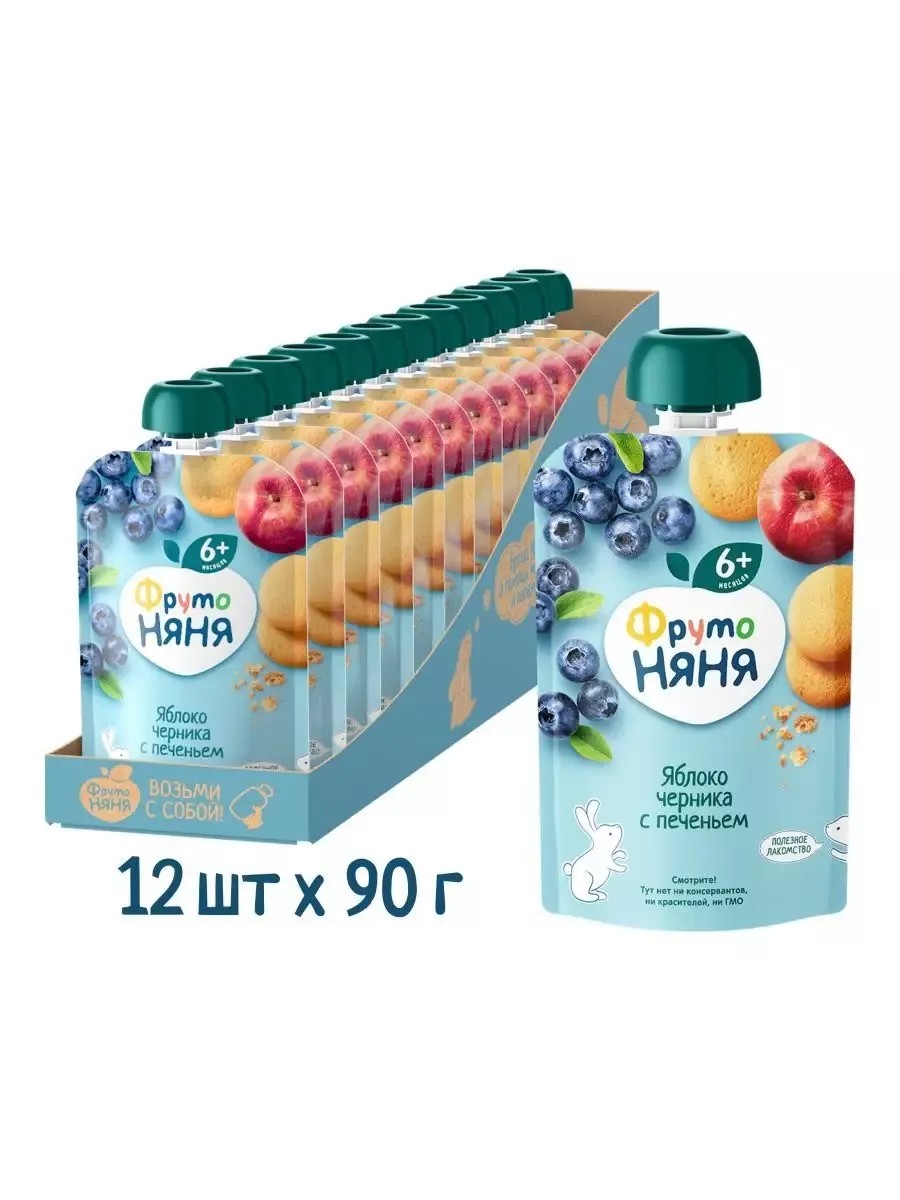 | Комплектация | Пюре яблочно-черничное с печеньем, 90г (12шт) |