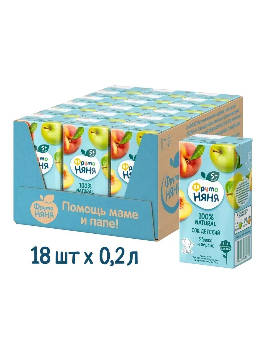 Фруктовый сок «ФрутоНяня» яблоко-персик — идеальный выбор для питания вашего малыша с 5 месяцев. Натуральные отборные фрукты, ягоды и овощи обеспечивают ребёнка природной пользой и энергией для гармоничного роста и развития. Бережная технология приготовления сохраняет все полезные свойства фруктов, ягод и овощей. Современное производство соответствует высоким стандартам безопасности и качества.