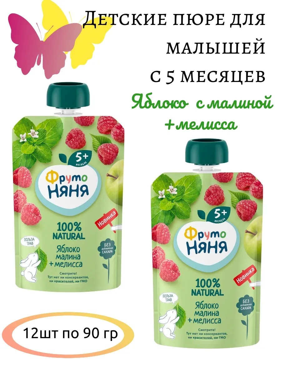 Фруктовое пюре в мягкой упаковке ФрутоНяня Яблоко, малина, мелисса — это вкусный и полезный перекус, который удобно брать с собой, а яркая мягкая упаковка привлечёт внимание вашего малыша и позволит ему есть самостоятельно. Отборная малина, спелые яблоки обеспечат вашего малыша природной пользой и энергией для гармоничного роста. А натуральный экстракт мелиссы придаст пюрешке приятный аромат и поможет вашему малышу крепчке спать за счет своего успокаивающего действия.