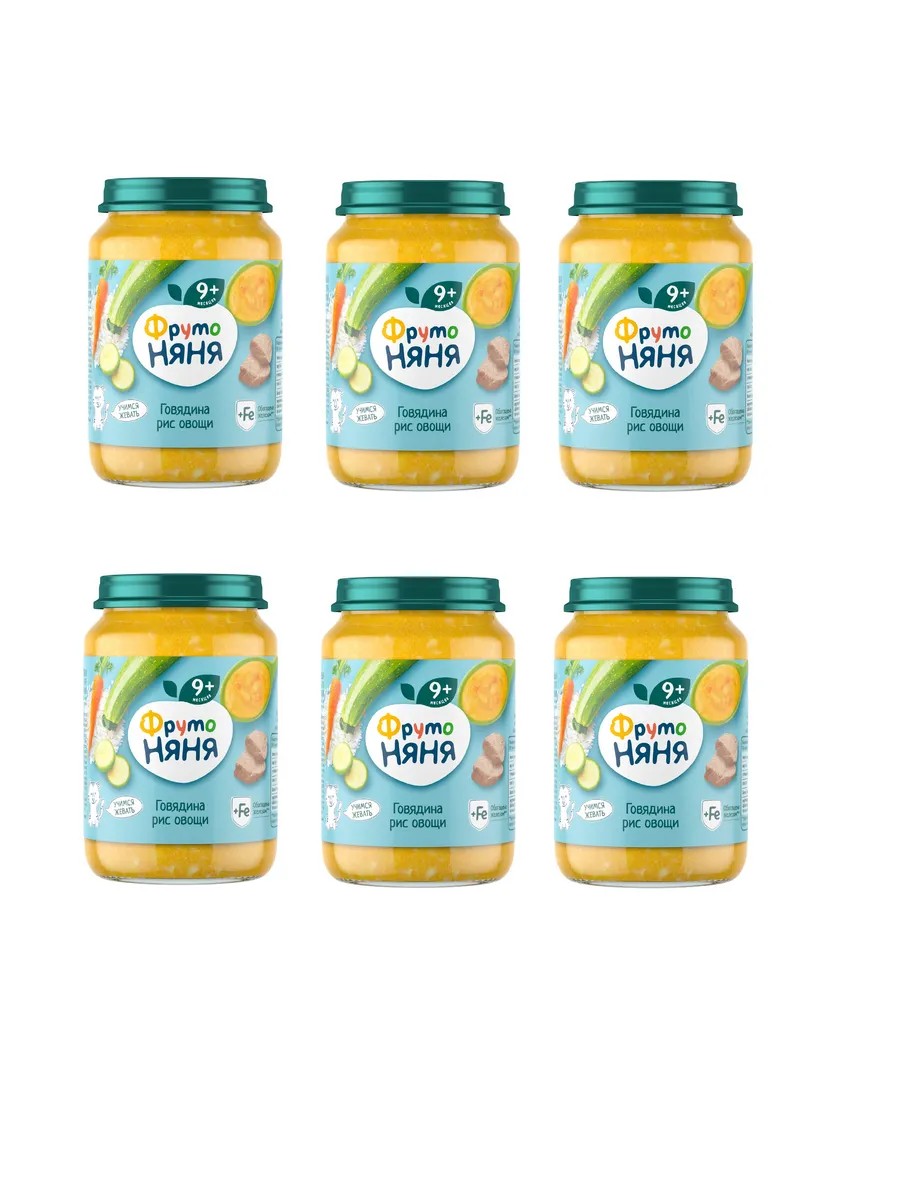ФрутоНяня, Пюре мясо-растительное детское Говядина, рис и овощи с 9 месяцев 190 г, 6 штук. Пюре Фрутоняня говядина-рис-овощи представляет собой яркий и насыщенный продукт, рассчитанный на детей раннего возраста. В нем говяжье мясо гармонично сочетаются с овощами и рисом. Продукт полностью готов к употреблению. Достаточно переложить необходимое количество пюре в посуду, подогреть его и тщательно перемешать. Вводить рекомендуется постепенно. Состав: Вода, морковь, кабачок, говядина, мука рисовая, рис, лук репчатый, масло подсолнечное, соль йодированная, железа (III) пирофосфат.