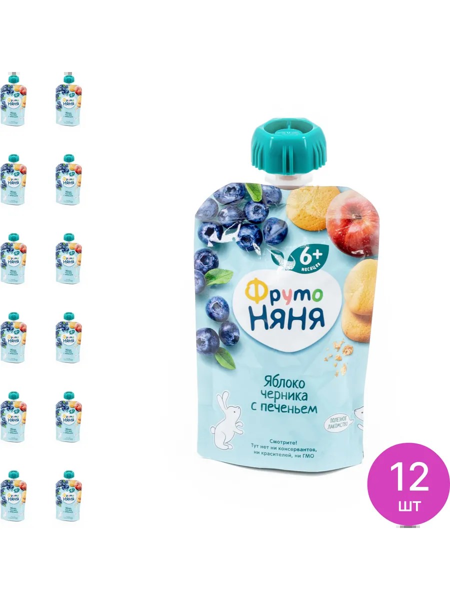 Frutonyanya Apple Blueberry Puree with Cookies, 90g. Set contains 12 pieces. Price per set. Fruit puree is a ready-to-eat dietary product made from fresh, heat-treated fruits and berries. Fruit and berry purees are used for baby food—for children up to 3 years old—as well as for preparing various desserts and sauces for dishes. Most often, non-acidic fruits rich in pectin and plant fiber, which have a positive effect on the digestive system of babies, are used to prepare fruit puree for babies: apples, pears, apricots, and plums. Blueberries are the most commonly used berry. Fruit purees are rich in vitamins, especially vitamin C, and contain folic acid, which plays an important role in hematopoiesis. Choose fruit puree to introduce your baby to new flavors and diversify their diet with essential vitamins and minerals.