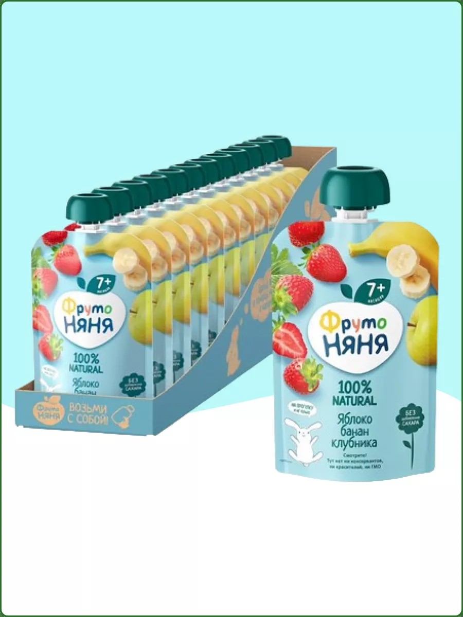 Фруктовое пюре ФрутоНяня Яблоко, банан, клубника в мягкой упаковке — это вкусный и полезный перекус, который удобно брать с собой, а яркая мягкая упаковка привлечёт внимание вашего малыша и позволит ему есть самостоятельно. Ароматная клубника, сочные бананы и спелые яблоки обеспечат организм вашего малыша природной пользой и энергией для гармоничного роста.
